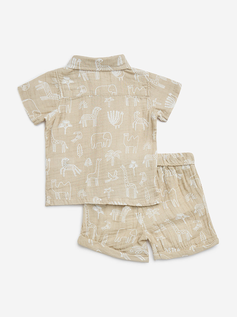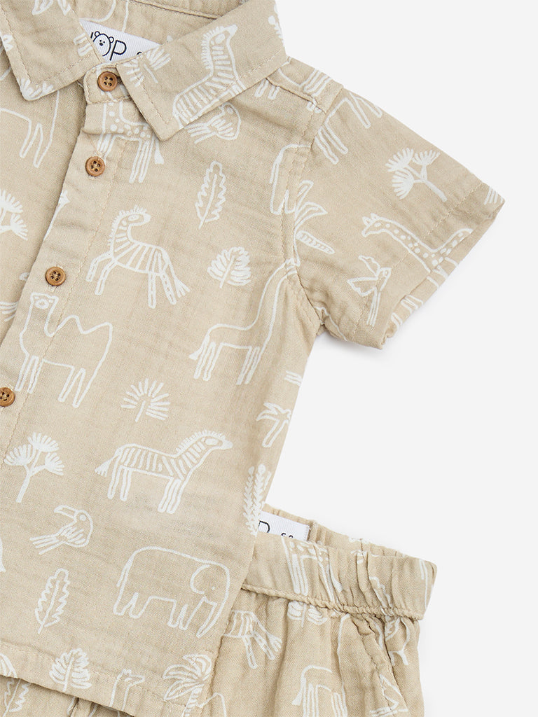 HOP Baby Beige Animal Printed Cotton Shirt and Shorts Set