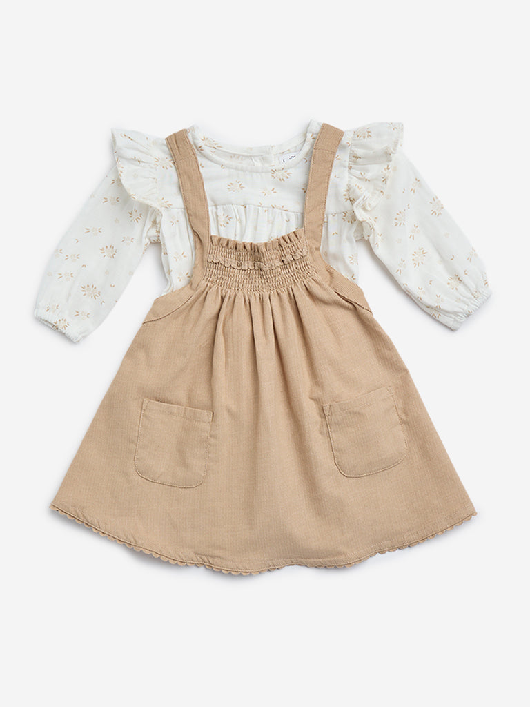 HOP Baby Beige Cotton Pinafore and Top Set