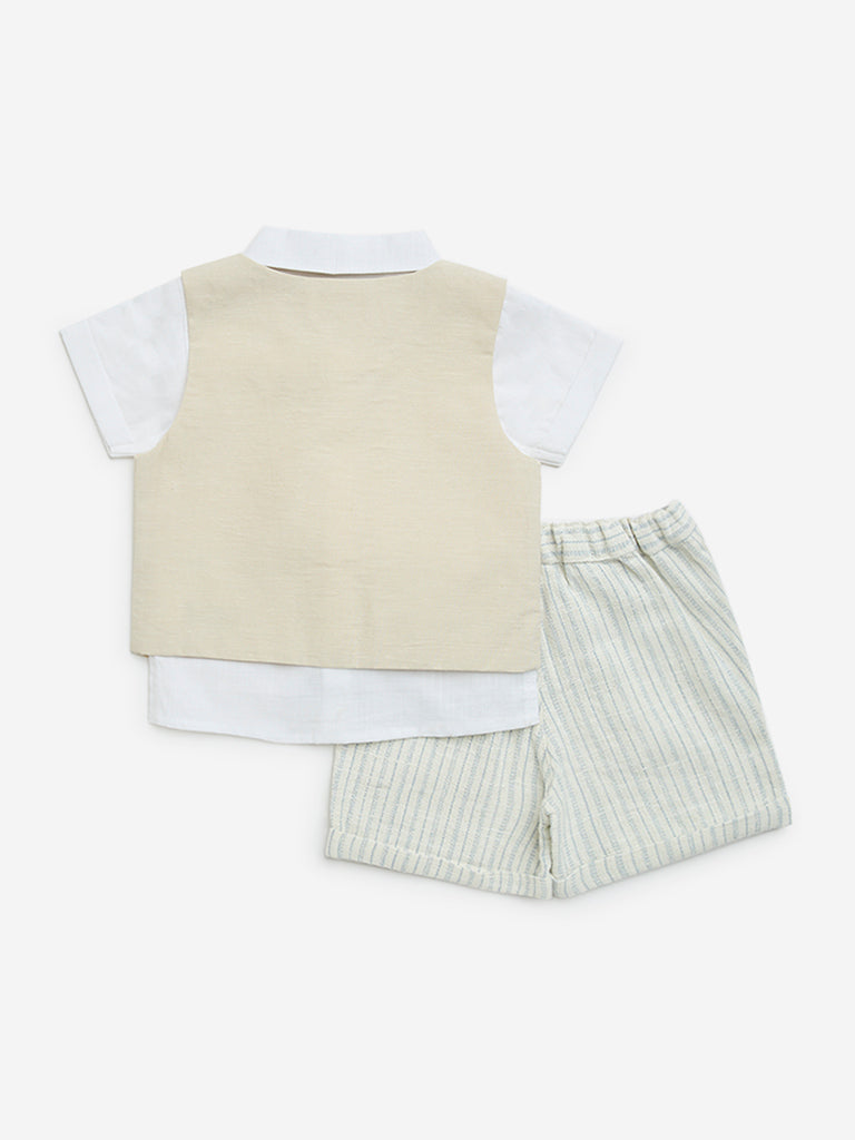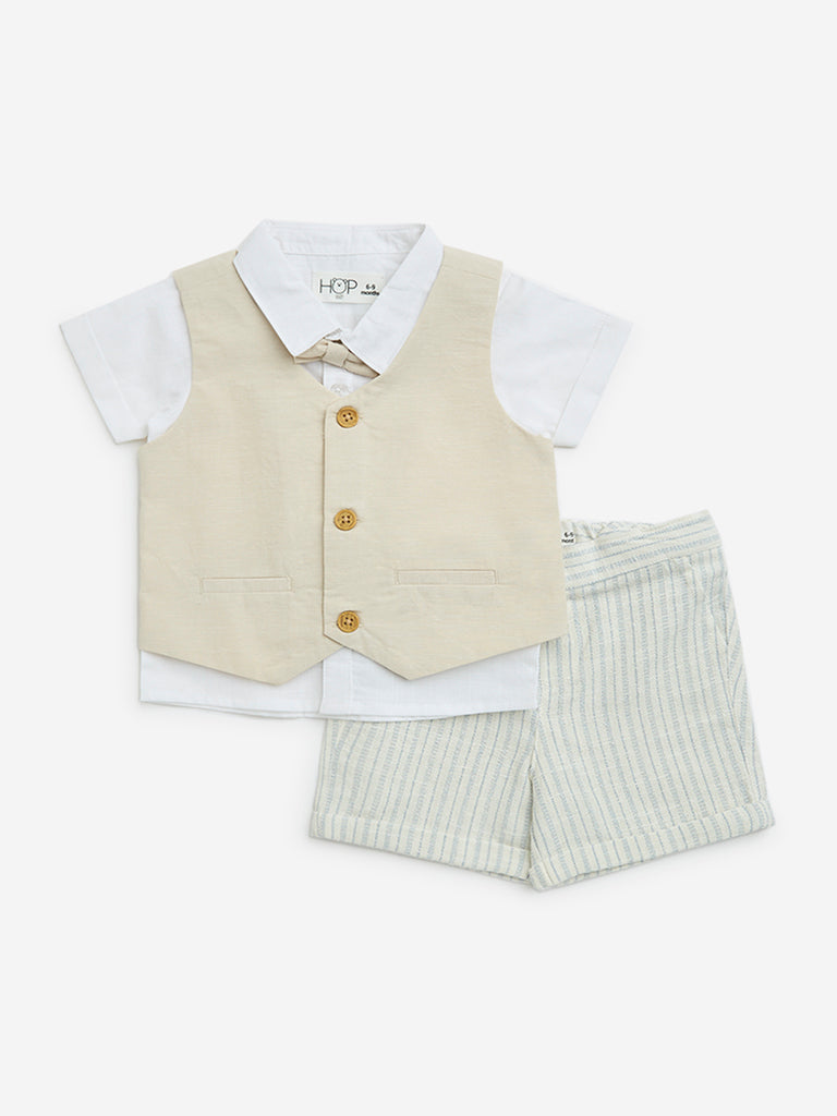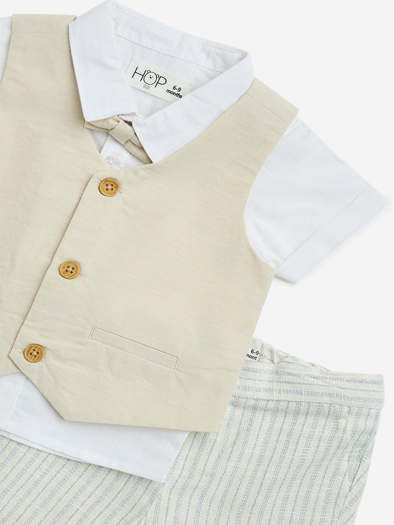 HOP Baby Beige Cotton Waistcoat. Shirt. Shorts and Bow Set