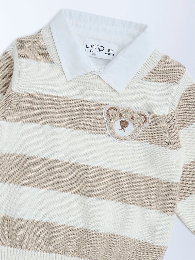 A cozy layer for cooler days. this beige sweater from HOP Baby is woven in a soft cotton blend. Detailed with classic stripes and a playful teddy motif. it features a sharp collar and full sleeves. offering warmth. comfort and a touch of sweetness to everyday dressing.