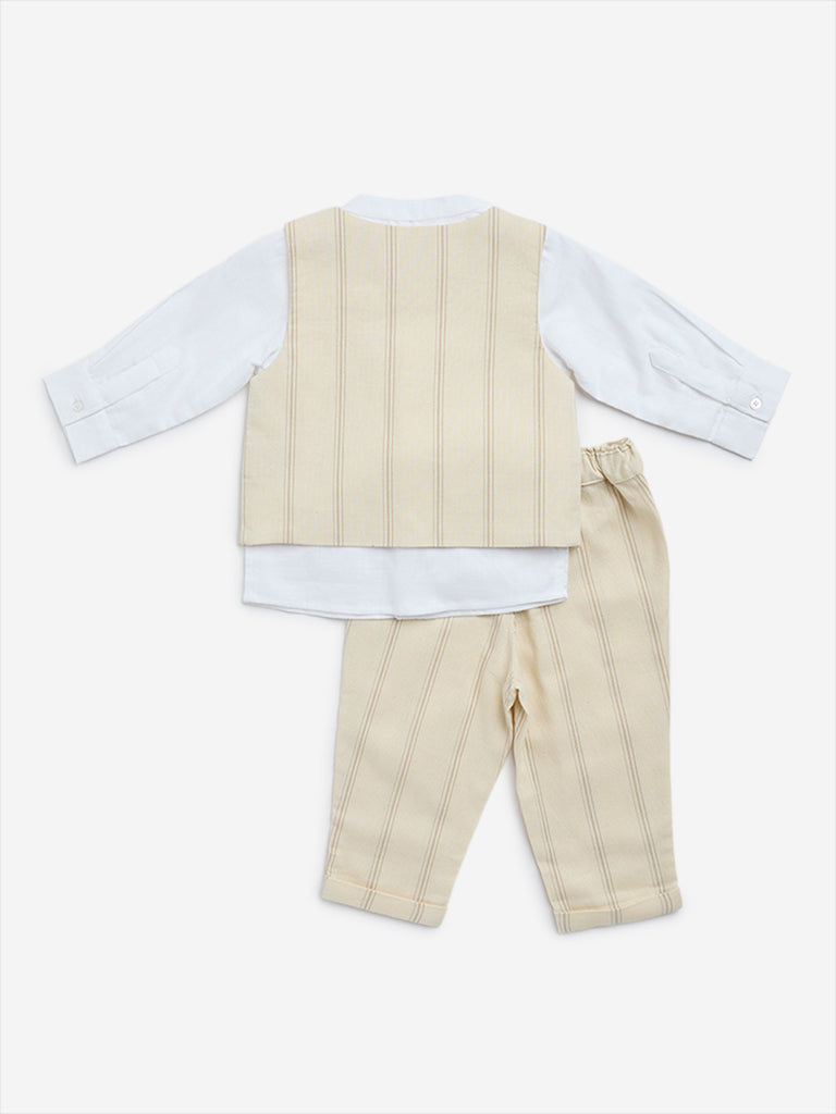 HOP Baby brings you this waistcoat set including a waistcoat. shirt and pants. A white shirt with a mandarin collar and full sleeves is paired with a beige waistcoat featuring stripes. A complementary pair of pants with similar stripes complete this ensemble.