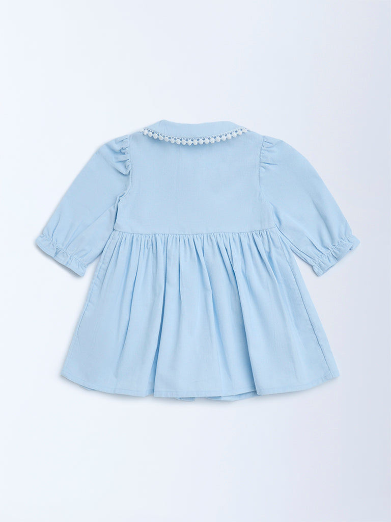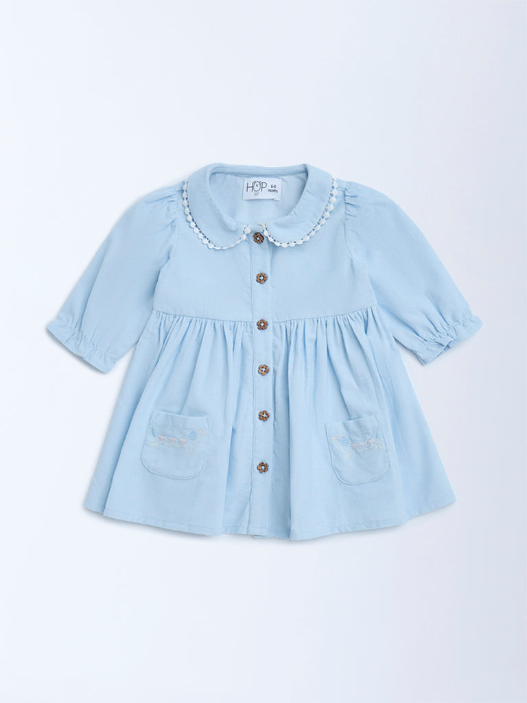Elevate your little angel’s outdoor edit with this blue dress from HOP Baby. Spun from pure cotton in an A-Line frame. it is designed with a crisp Peter Pan collar. a button placket. and puff sleeves. The dual pockets at the front lend a functional bonus.