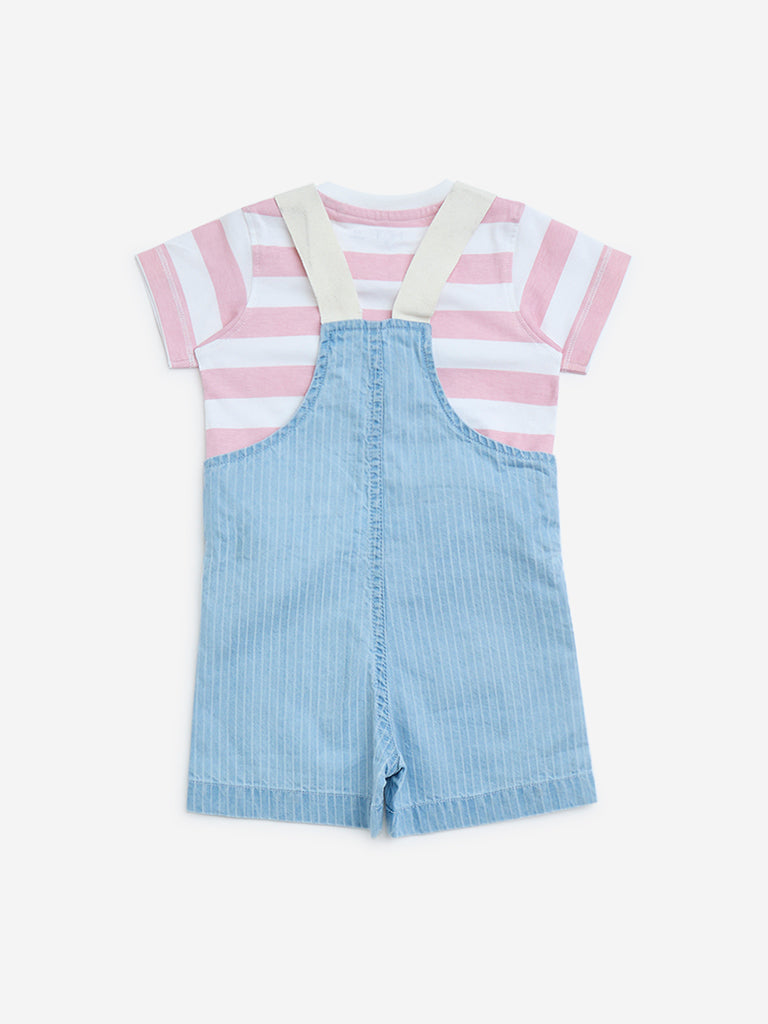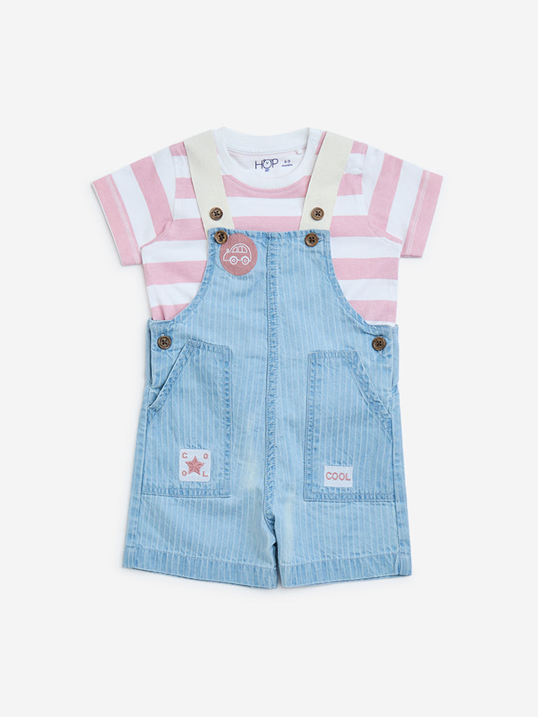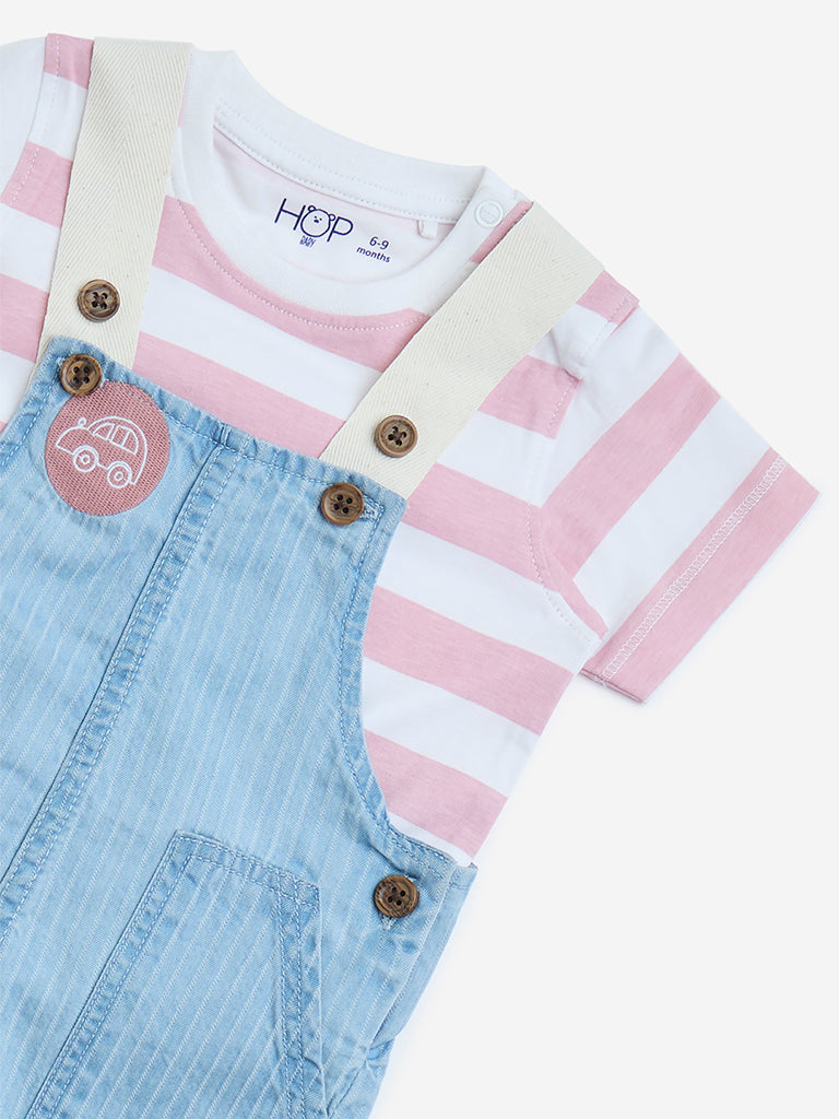 HOP Baby Blue Cotton Dungaree with Striped T-Shirt Set