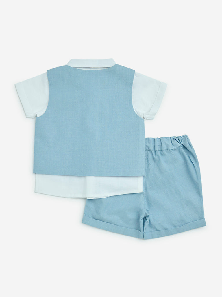 HOP Baby Blue Cotton Waistcoat. Shirt. Shorts and Bow Set