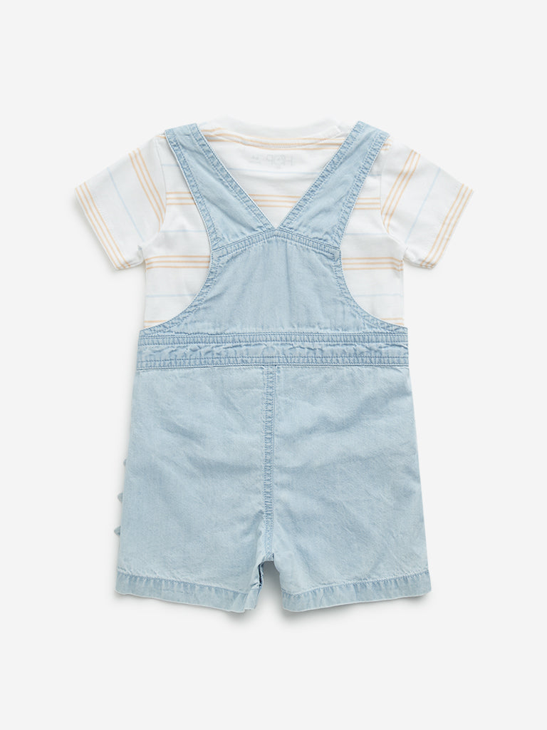 HOP Baby Blue Dinosaur Cotton Dungaree with T-Shirt Set