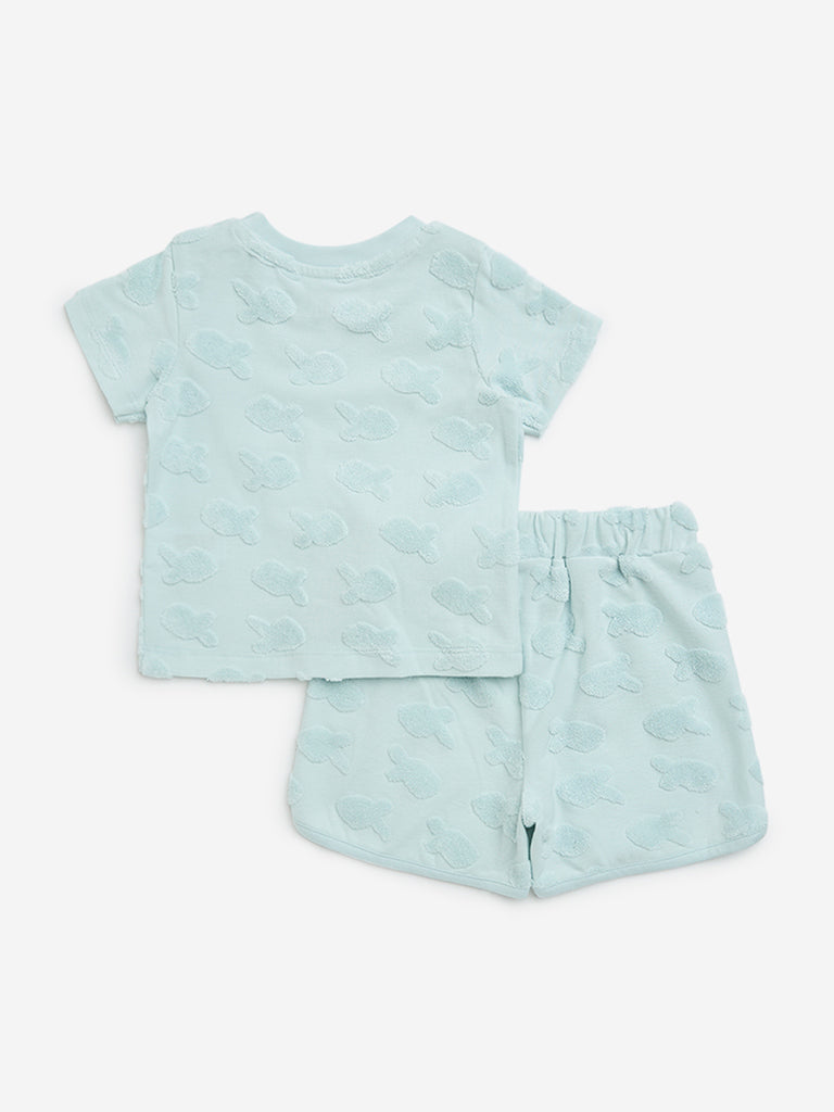 HOP Baby presents this adorable blue t-shirt and shorts set. designed with marine-inspired embroidery for a playful touch. The t-shirt features a classic round neck and short sleeves. while the high-rise shorts come with a smooth elastic waistband and adjustable drawstrings for a snug and comfy fit.