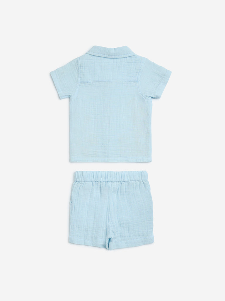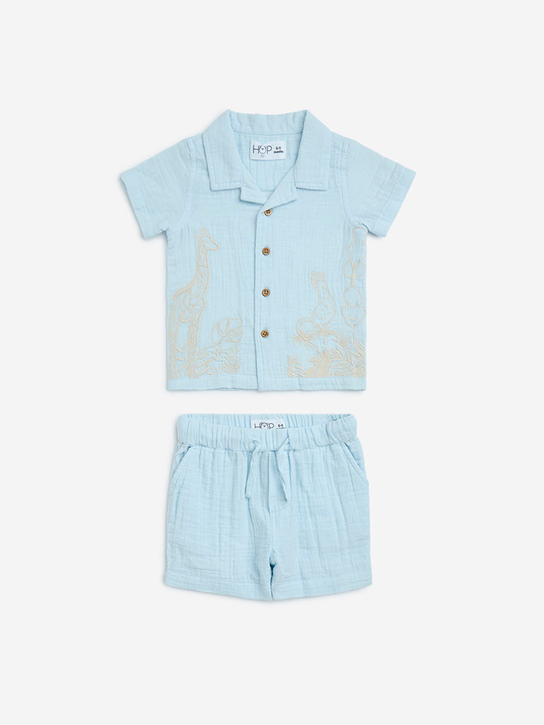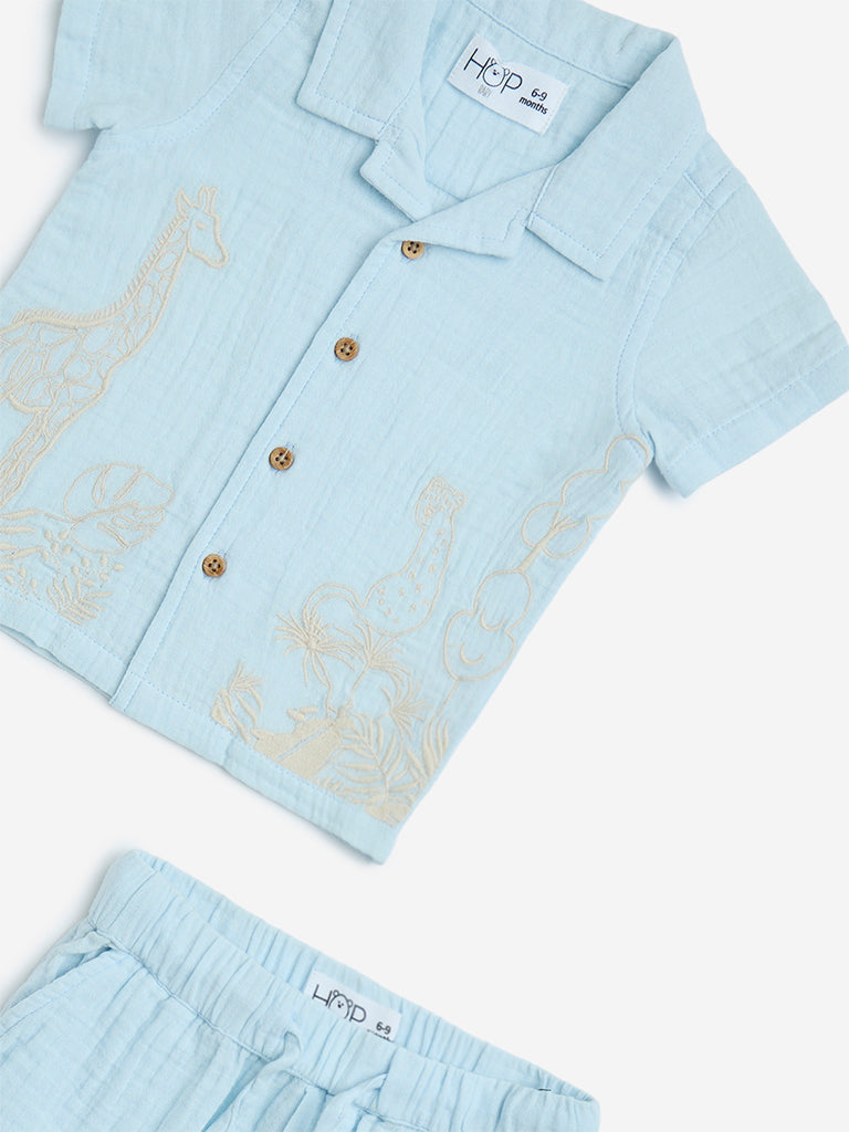 HOP Baby Blue Embroidered Cotton Shirt with Shorts Set