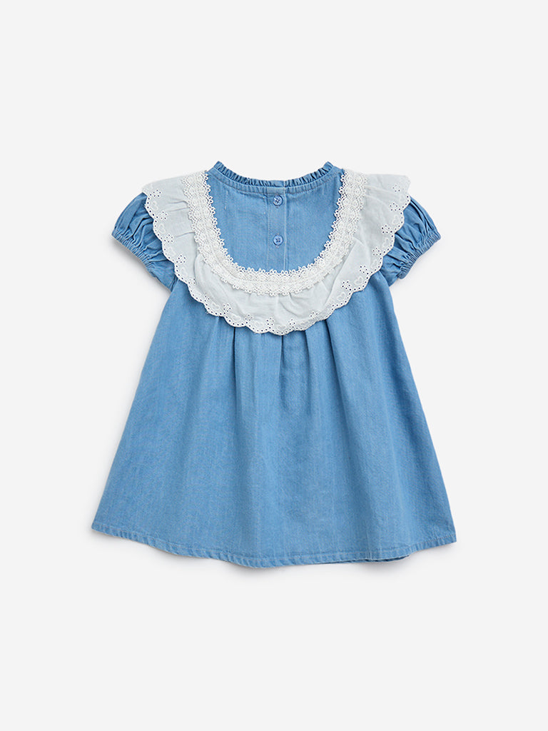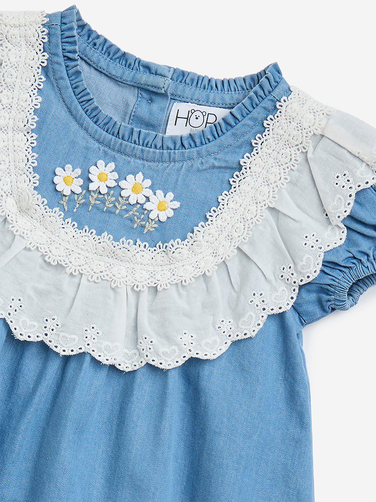 HOP Baby presents this blue denim dress. beautifully accented with floral embroidery for a charming touch. Designed in a breezy A-line silhouette. it features a round neckline and puff sleeves. while a ruffled yoke with intricate lace detailing adds to its playful appeal. Crafted from pure cotton. it offers a soft. breathable feel for all-day comfort.