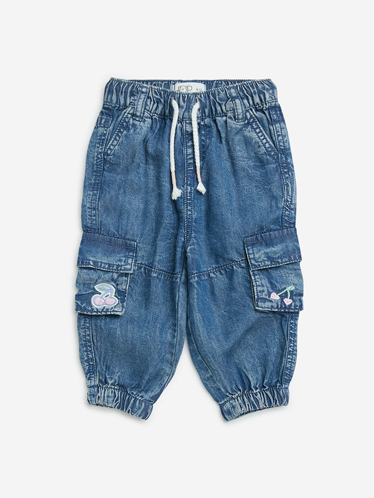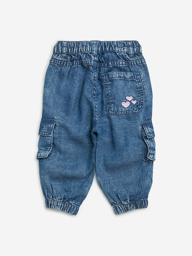 HOP Baby brings these blue high-rise denim joggers. crafted from soft. lightweight fabric for all-day ease. The elasticated waist with adjustable drawstrings ensures a secure yet flexible fit. while multiple pockets add a touch of utility. A perfect blend of comfort and style. these joggers are ideal for your little one’s everyday adventures.