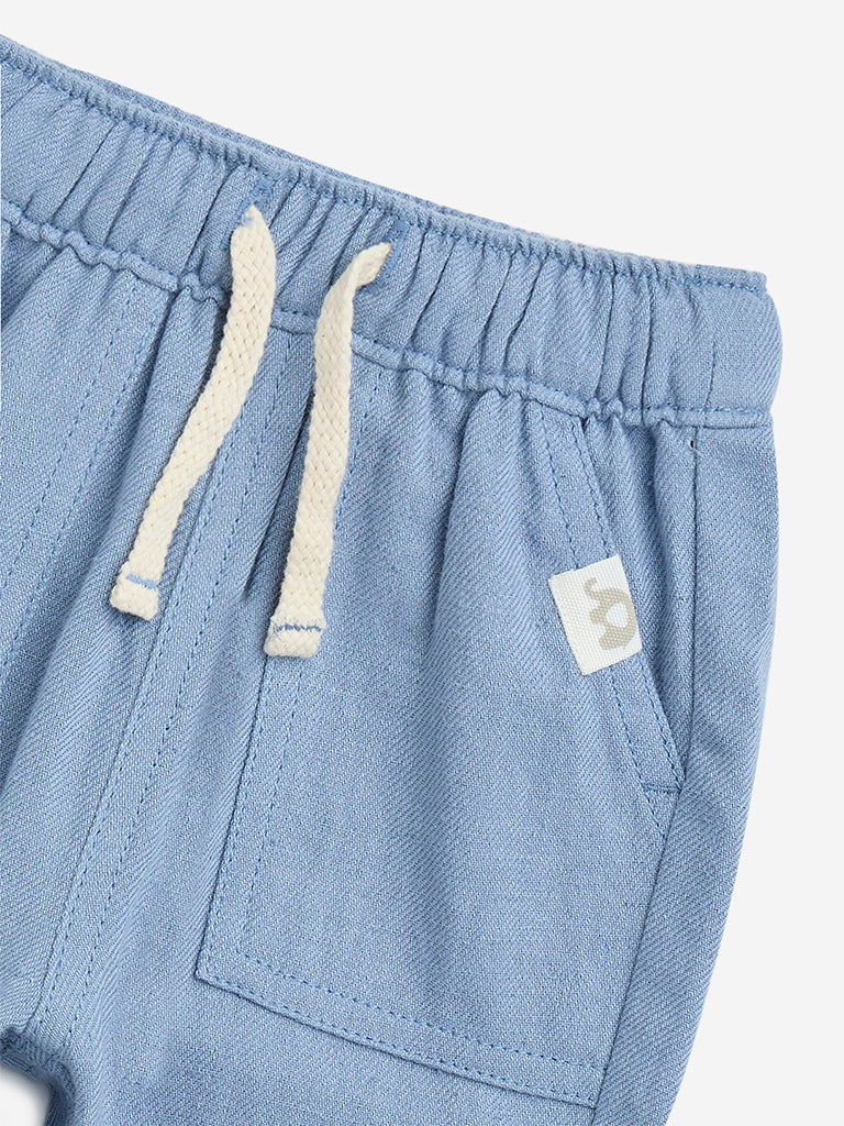 HOP Baby presents these blue pants. crafted from a soft cotton blend for a gentle feel against the skin. Designed for all-day comfort. they feature a mid-rise silhouette with an elasticated drawstring waistband for a secure. adjustable fit. Side pockets add a practical touch.