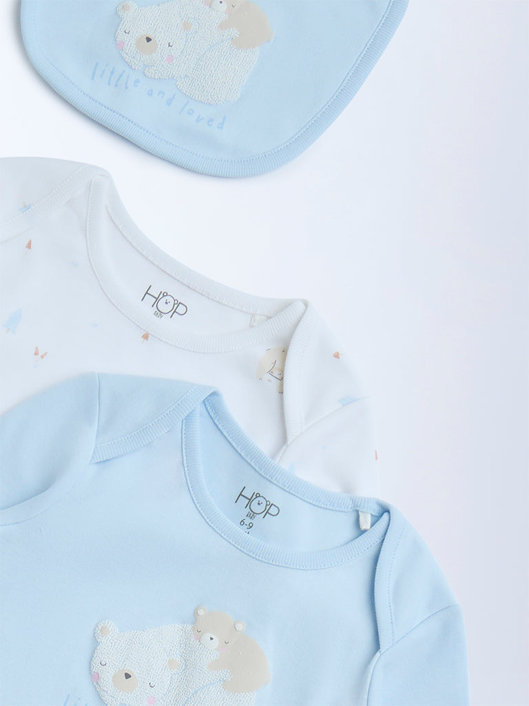 HOP Baby Blue Printed Cotton Rompers with Bib – Pack of 2