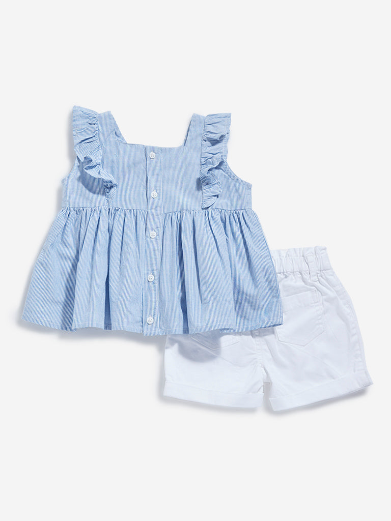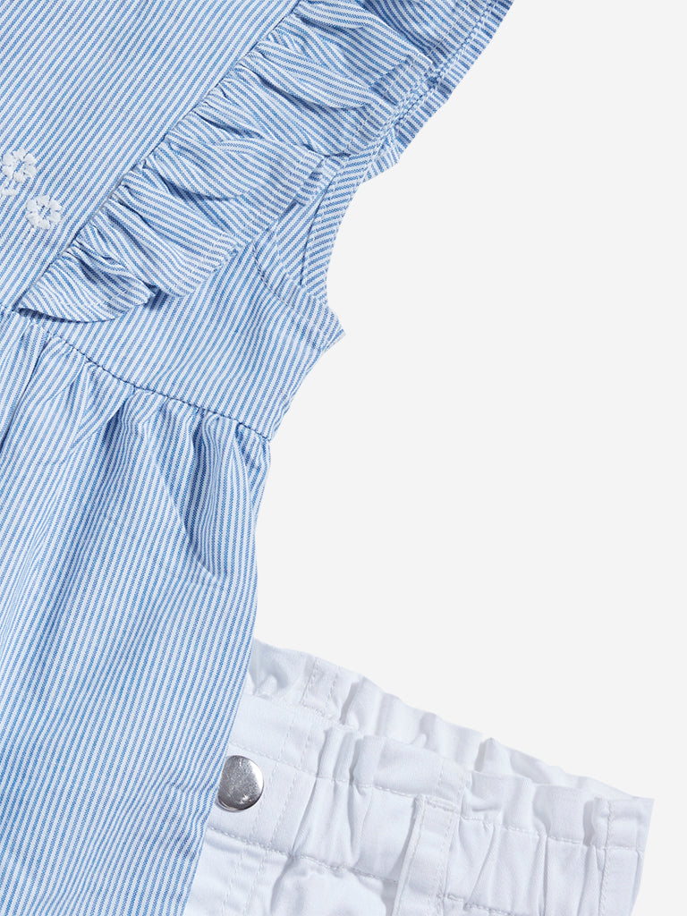 HOP Baby presents this adorable set with a blue dress and white shorts. The dress features stripes with a square-neck and ruffles on the bodice. The shorts come with an elasticated waist and button-closure for easy wearability.