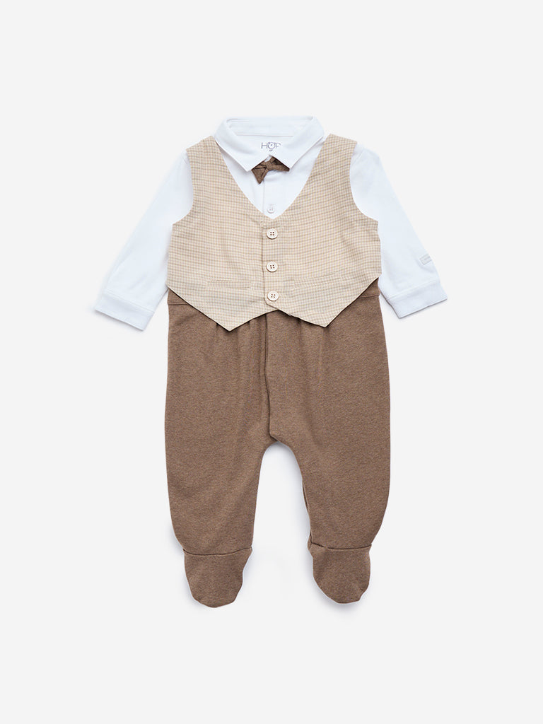 This adorable beige and brown sleepsuit from HOP Baby features a charming bow tie and buttoned vest design. Crafted from soft fabric. it ensures comfort while adding a dapper touch to your little one’s look.