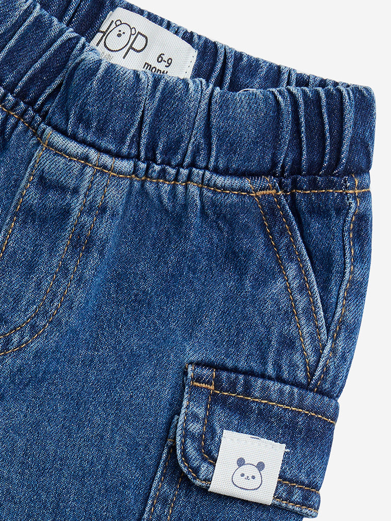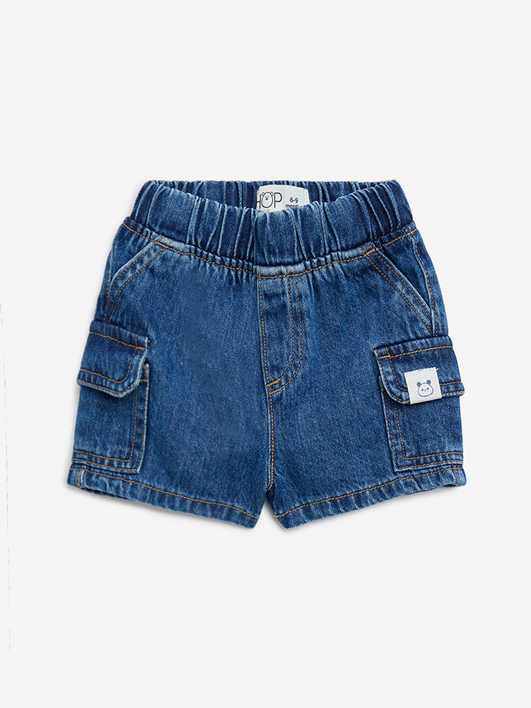 HOP Baby introduces these dark blue shorts. crafted from pure cotton for a soft. breathable feel. Designed with a mid-rise fit and an elastic waistband for effortless wear. this pair is complete with multiple pockets. combining practicality with everyday charm for your little one.