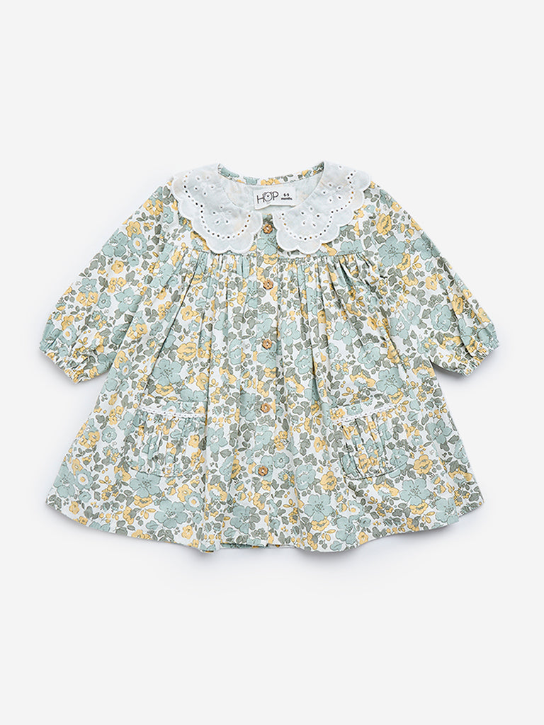 This charming green floral dress from HOP Baby features a delicate white lace collar and full sleeves. adding a vintage-inspired touch. Its soft. breathable fabric ensures all-day comfort for your little one.