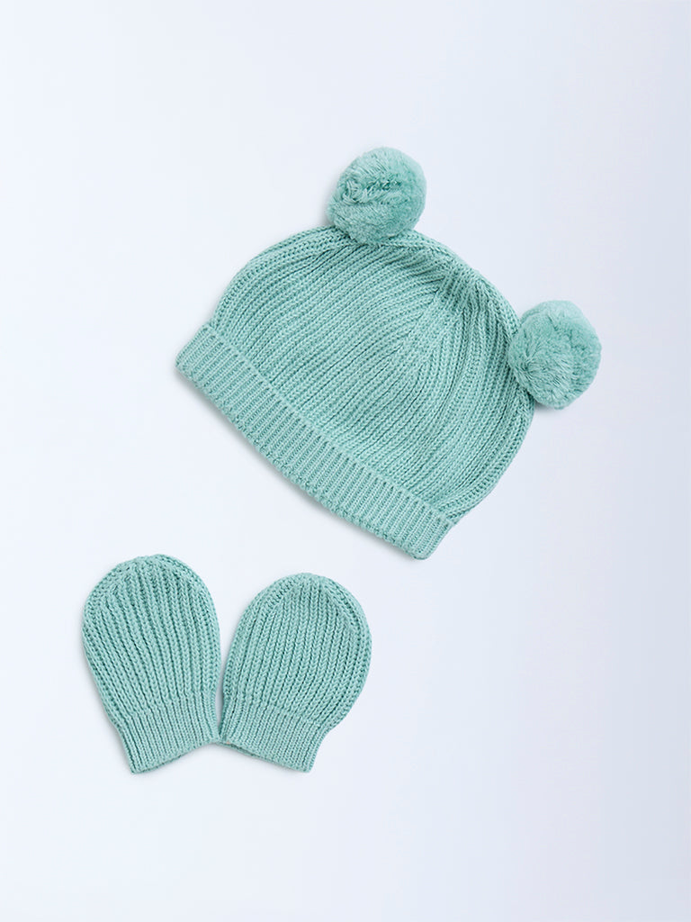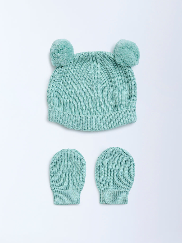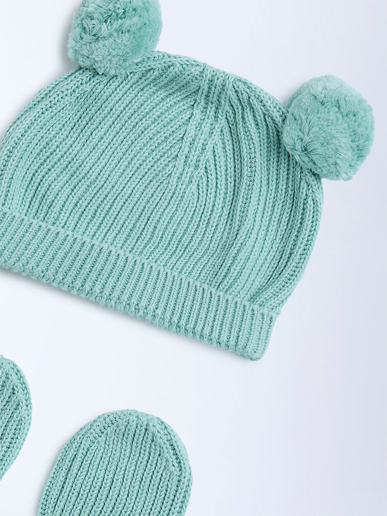 HOP Baby Green Knitted Cotton Hat with Mittens Set