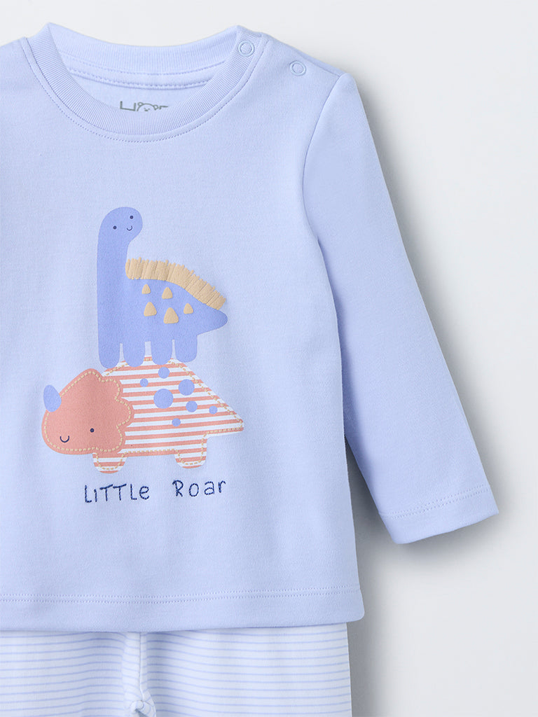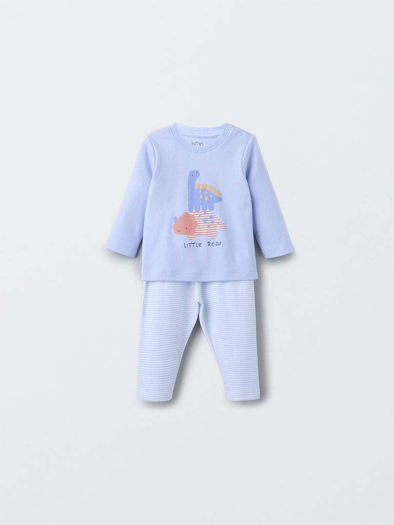 Keep your little one cosy and cheerful with this charming co-ord set from HOP Baby. The soft lavender t-shirt and pants features an adorable dinosaur print. bringing a playful twist to everyday dressing. Designed with a crew neck and snap button fastening at the shoulder. it ensures quick and fuss-free changes. Paired with striped bottoms that offer a gentle stretch. the set combines comfort with sweet style.
