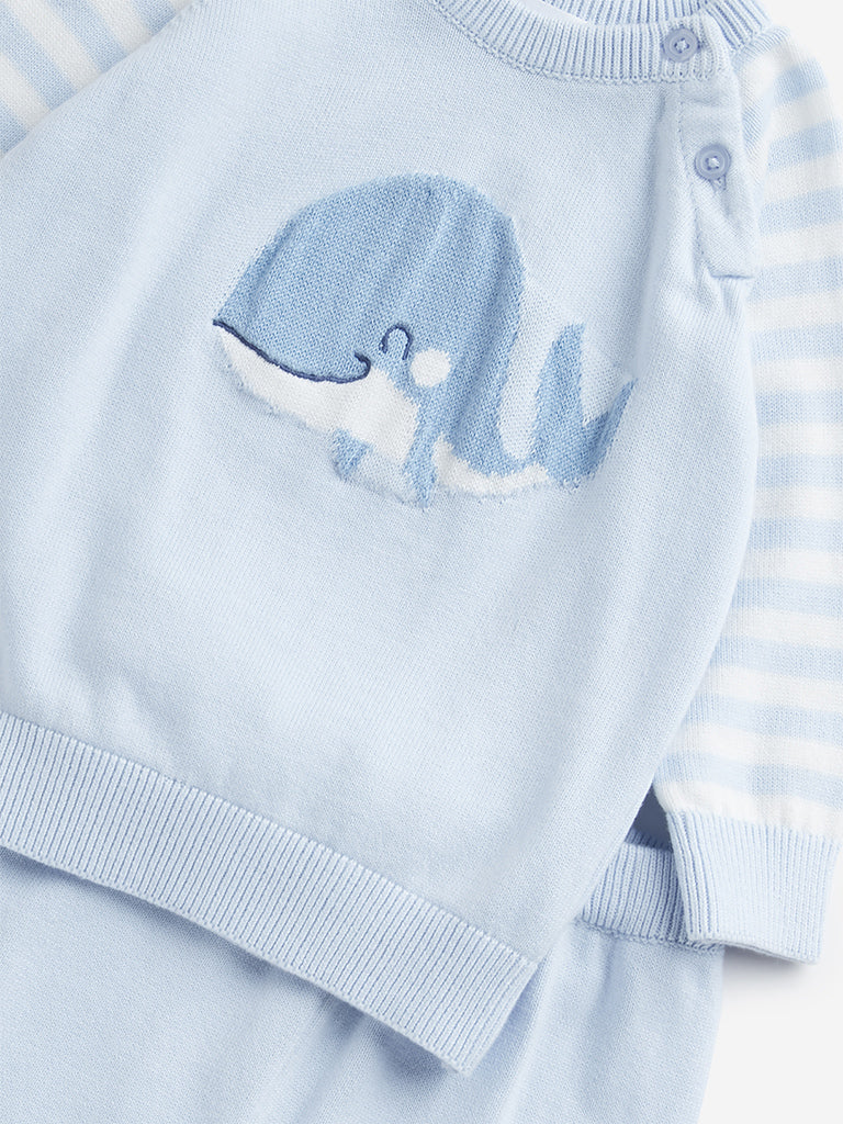 This light blue set from HOP Baby comprises of a sweater and pair of pants. Crafted from a cotton-rich fabric. it ensures easy comfort for your little one. The sweater showcase playful whale prints at the front and is complete with a round neck. snap buttoning and full sleeves. The mid-rise pants come fitted with an elasticated waistband for superior comfort.