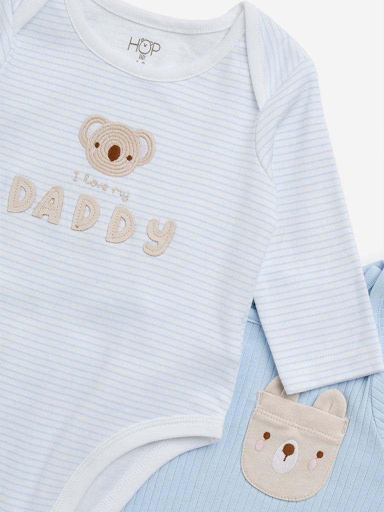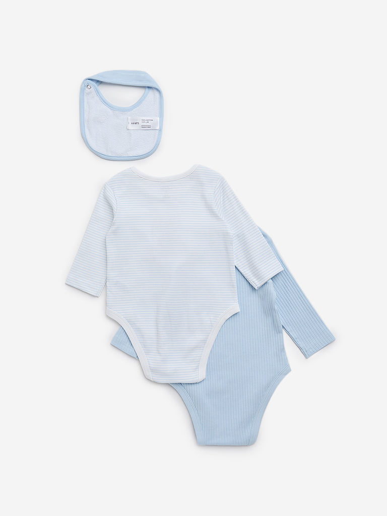 HOP Baby Light Blue Animal Print Cotton Rompers and Bib – Pack of 2