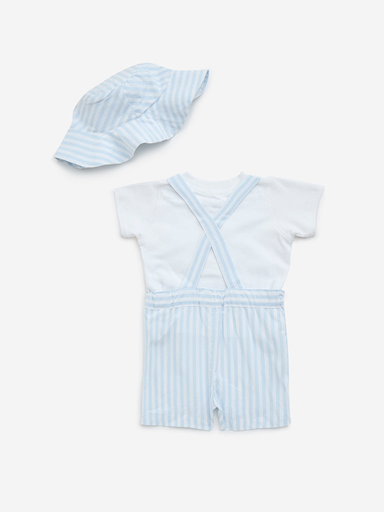 HOP Baby Light Blue Striped Cotton Dungaree. T-Shirt and Bucket Hat Set