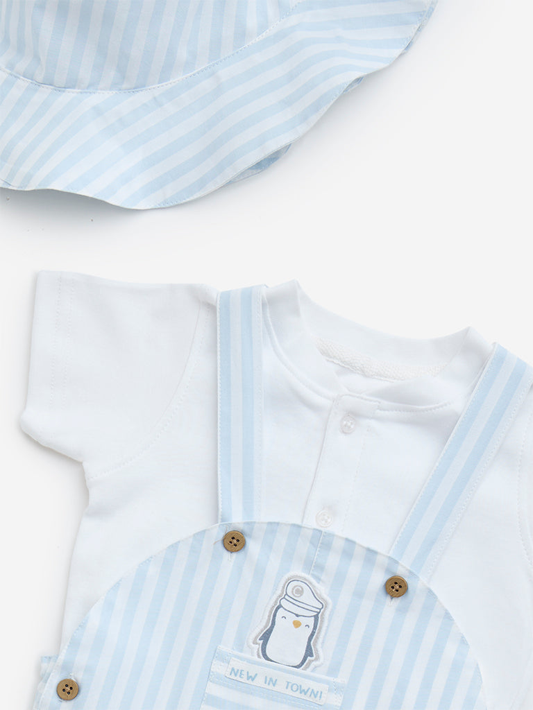 HOP Baby presents this dungaree set in a light blue hue with a playful striped pattern. Crafted from pure cotton for ultimate comfort. the set includes a t-shirt. a bucket hat. and dungarees adorned with an adorable penguin motif. The dungarees feature a front pocket and button closures for easy wearability. The t-shirt is designed with a band collar and short sleeves. completing this delightful ensemble.