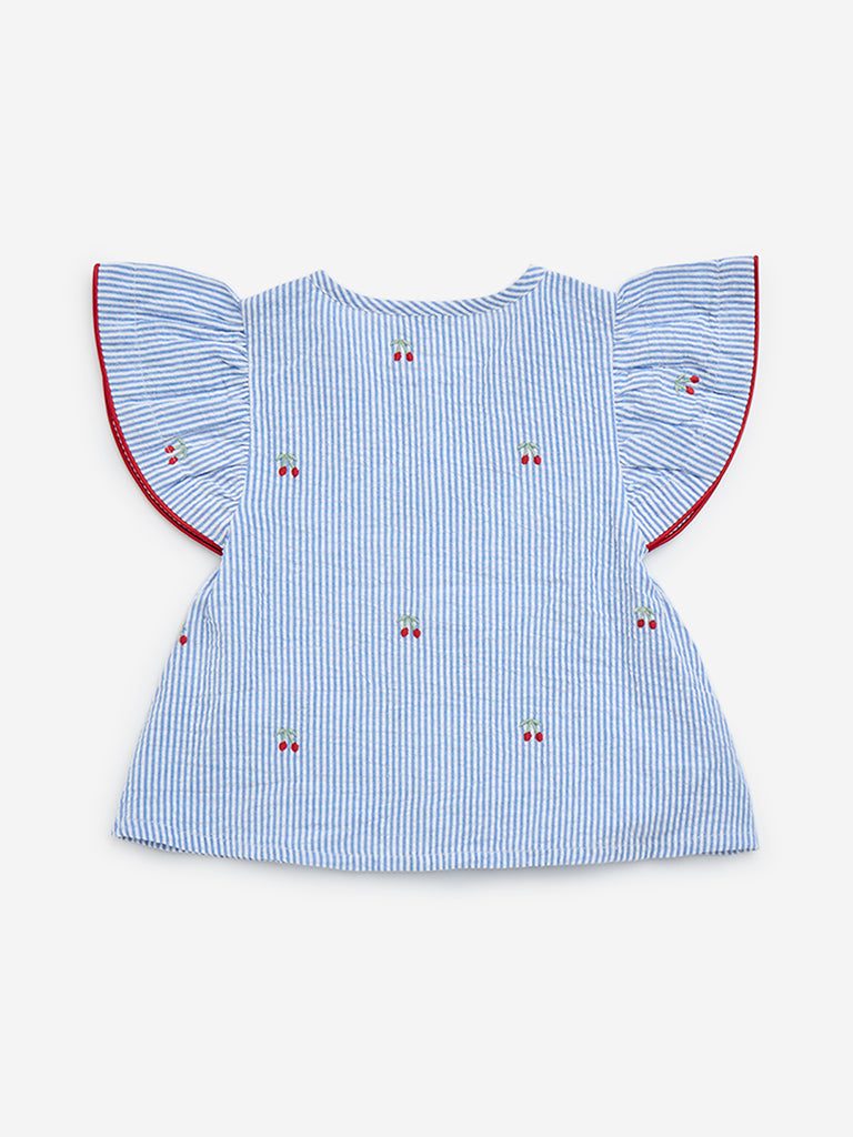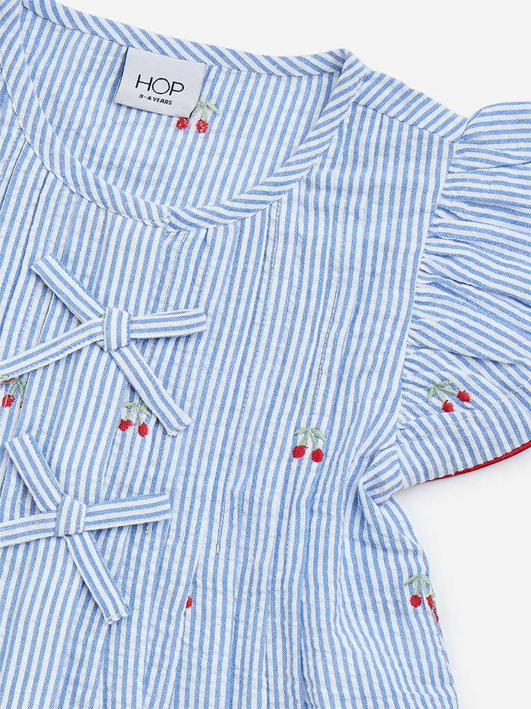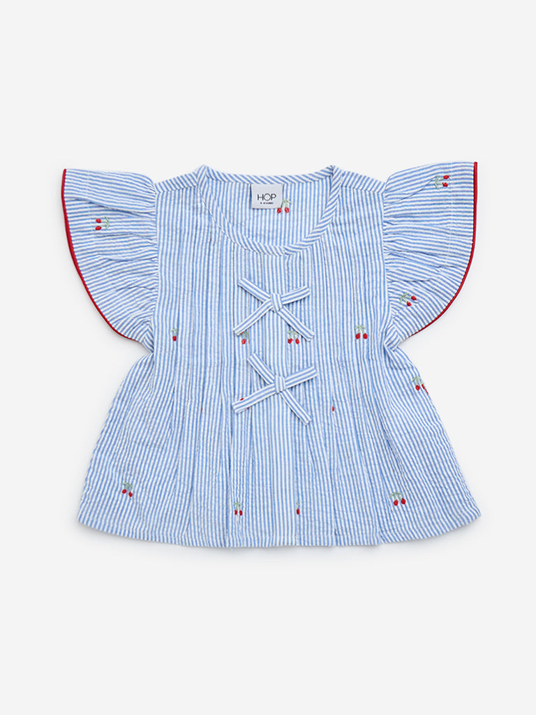 Made from pure-cotton. this light blue top from HOP Baby flaunts striped patterns. It also showcases playful cherry motifs and is complete with a round neck and angel sleeves. The bow detailing at the front lends an adorable finish.