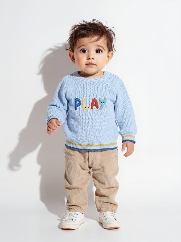 Keep it cosy and playful with this light blue sweater from HOP Baby. Crafted from a knit-textured fabric. it features charming text embroidery at the front along with a ribbed round neck and full sleeves for a cosy finish.