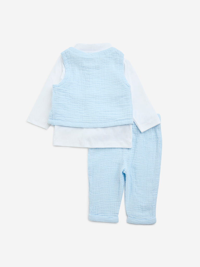 HOP Baby by Westside presents an elegant ensemble featuring a light blue textured waistcoat. paired with a crisp white shirt. tailored trousers. and a charming bow tie. The waistcoat adds a refined touch with its sophisticated texture. while the white shirt provides a clean. classic contrast. The trousers are designed for comfort and style. offering a perfect fit. and the bow tie adds a playful yet polished finishing touch.
