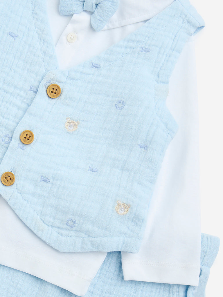 HOP Baby Light Blue Textured Cotton Shirt. Waistcoat. Trousers and Bow Set