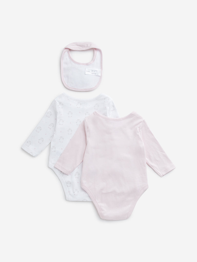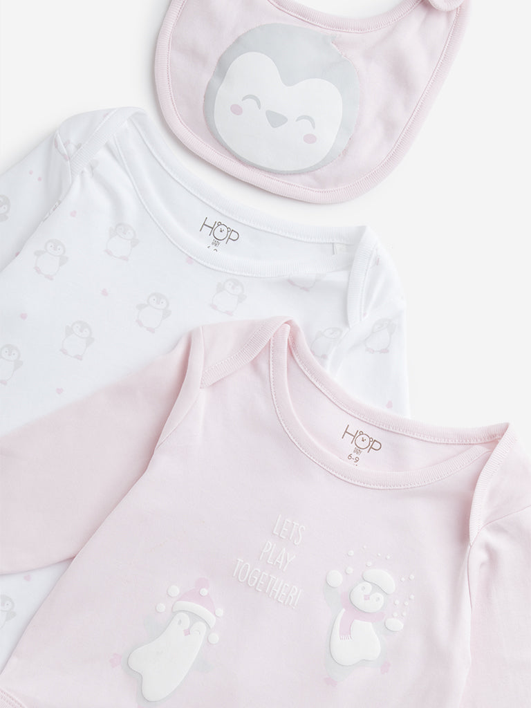 HOP Baby launches this set of two light pink rompers with playful penguin prints. Crafted from a cotton-rich fabric for superior comfort. they come fitted with a crewneck. full sleeves and snap buttoning at the bottom. The accompanying bib contains spills.