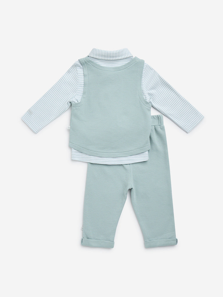 This light teal set by HOP Baby presents a shirt. waistcoat and pants. The waistcoat features a ribbed texture and flaunts cute animal designs. It is paired with a striped shirt with a bow tie and ribbed mid-rise pants.