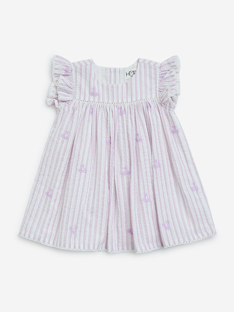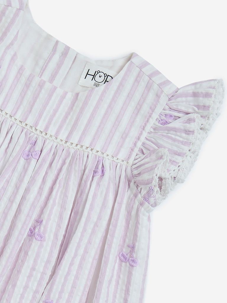 This lilac dress from HOP Baby is milled from pure cotton with a soft seersucker striped texture for breezy comfort. Dainty cherry embroidery adorns the yoke. while the round neck and fluttery butterfly sleeves add a sweet. playful finish.