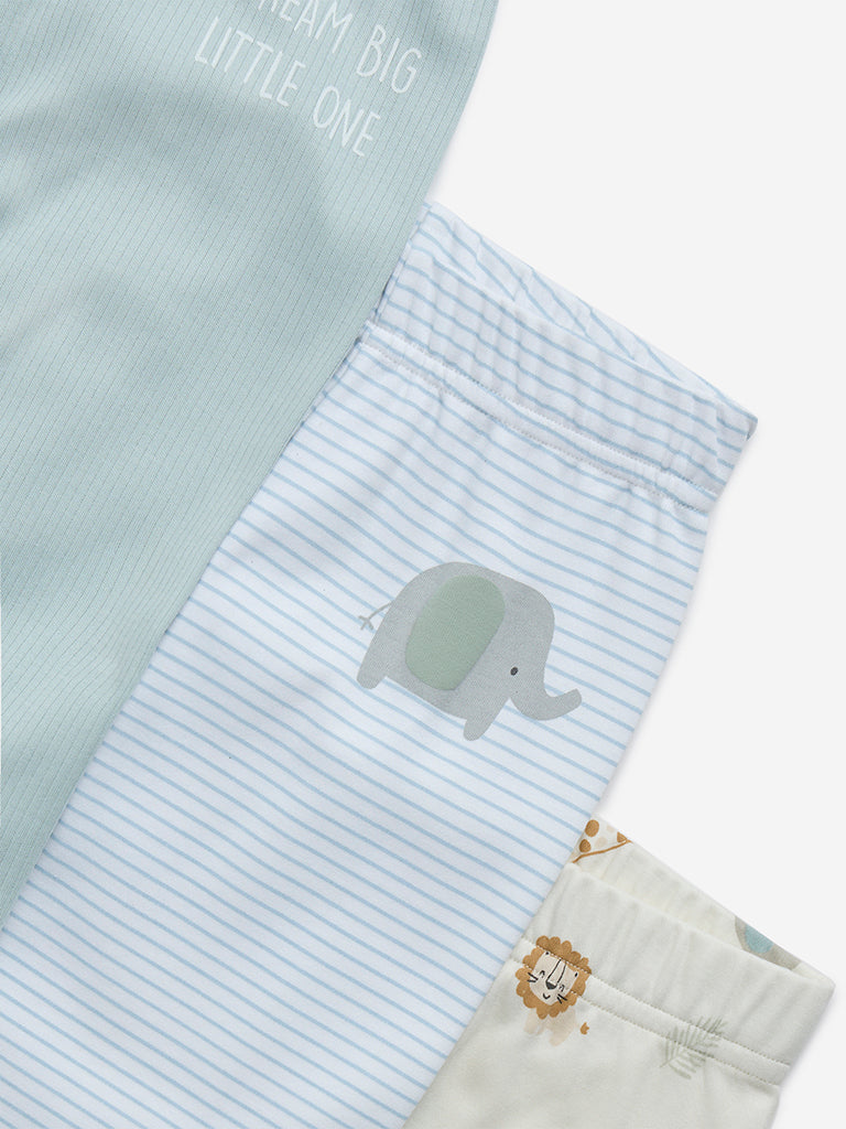 HOP Baby presents this set of three mint pants showcasing stripes and playful animal prints. They are made from pure-cotton and come fitted with an elasticated waistband for a personalised fit.