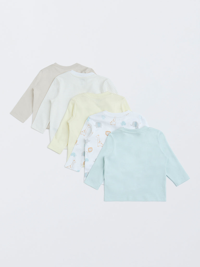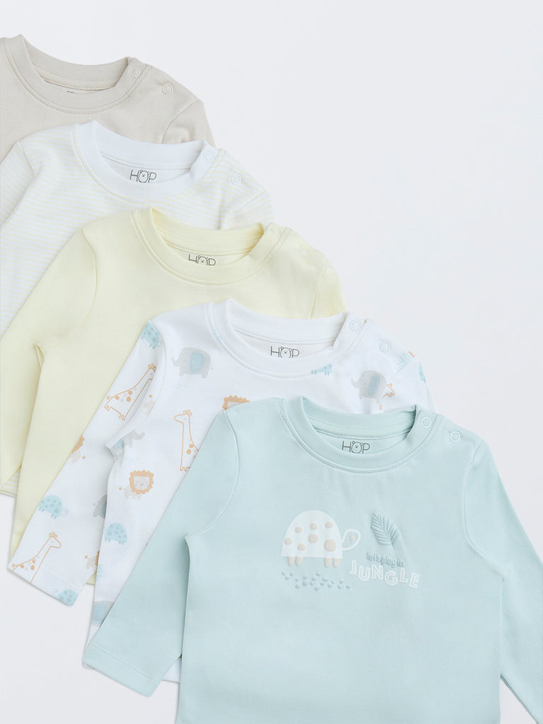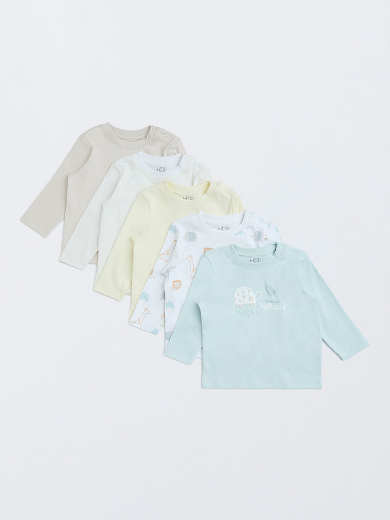 Designed for daily ease. this pack of five multicolour t-shirts from HOP Baby is made from breathable cotton. Each piece features a crew neck and full sleeves for a snug fit. The assortment includes a solid beige. a yellow striped design. a pastel yellow solid. a white tee with animal prints. and a mint green design detailed with a jungle motif.
