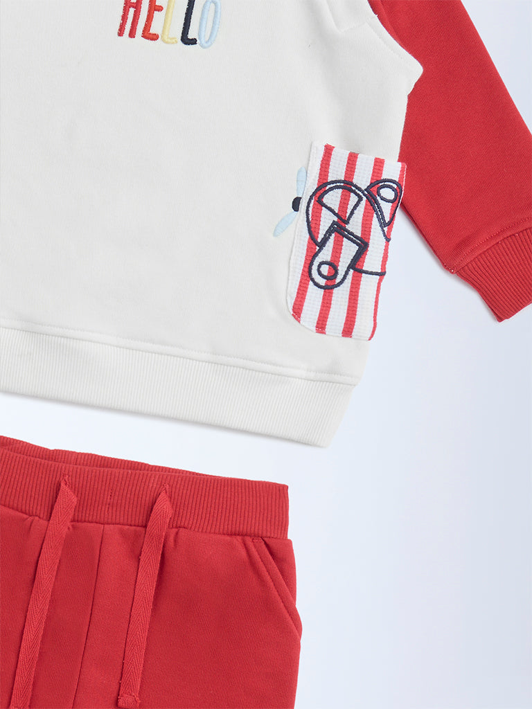 Bright and lively. this multicolour set from HOP Baby pairs a playful tee with colour-blocked sleeves. cheerful text embroidery and a striped patch pocket. Crafted from a soft cotton blend with a crew neck and full sleeves. it keeps little ones comfortable all day. The matching elastic-waist pants with drawstrings make it a fun and practical choice for everyday wear.