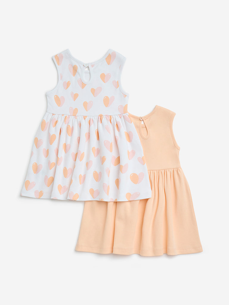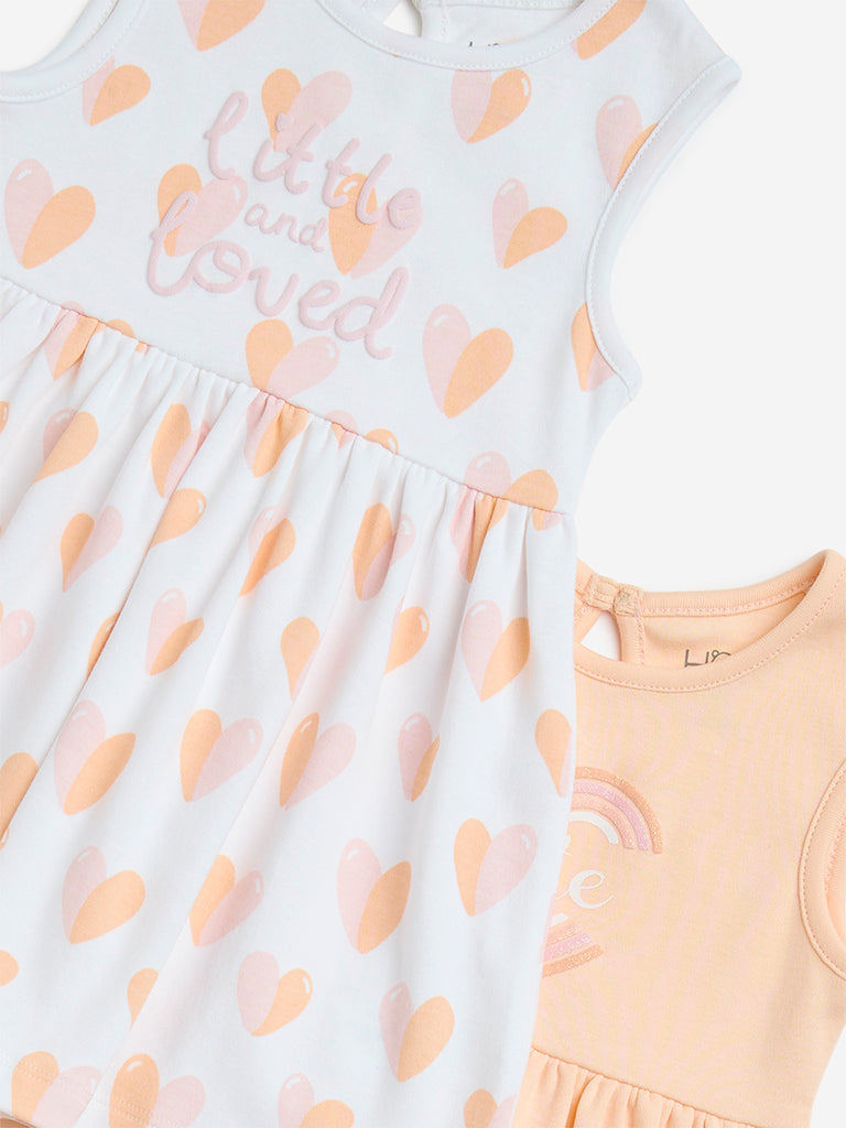 HOP Baby by Westside presents this set of two printed pure-cotton multicolour dresses. offering a playful and breezy choice for your little one’s wardrobe. One dress comes in a soft peach hue with text prints. while the other features a white base adorned with heart motifs. Designed in an airy A-line silhouette. both pieces come with a round neck and sleeveless profile.