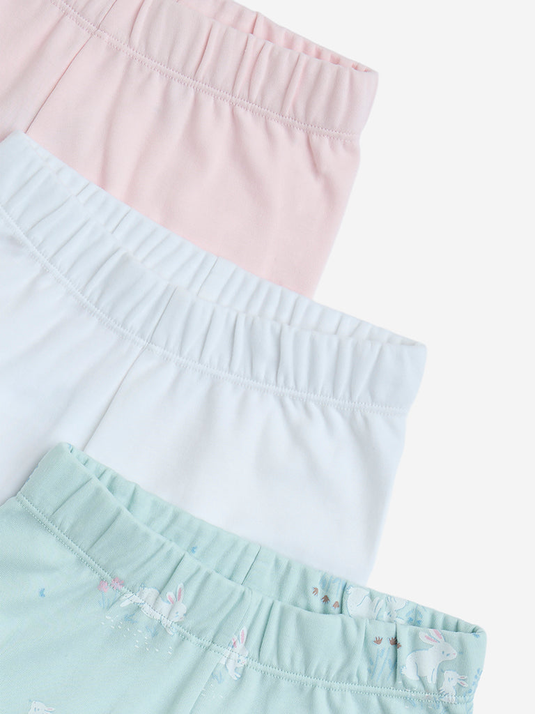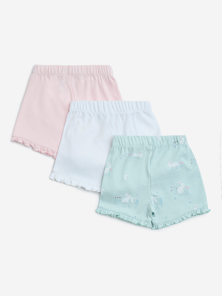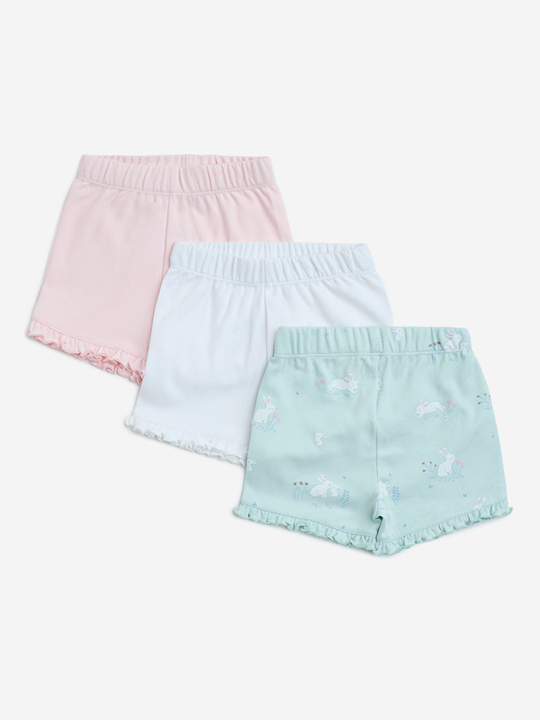 This pack of shorts from HOP Baby features a mix of bunny multicolour prints and solid designs in blue. pink and white variants. Woven from cotton-rich fabric. each pair is designed with a high-rise elastic waistband for a comfortable fit and finished with ruffled hems for a playful touch.