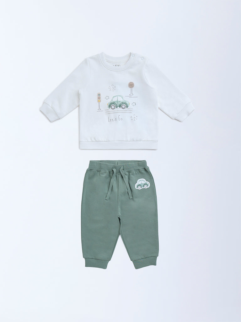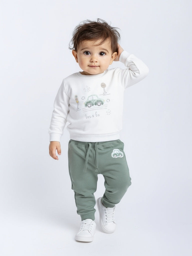 Gear up your little one for playful days with this multicolour set from HOP Baby. showcasing fun vehicle prints that spark imagination. The white sweatshirt comes with a ribbed crew neck and full sleeves for cozy comfort. while the sage joggers offer an elasticated waistband and ribbed cuffs for a snug fit.