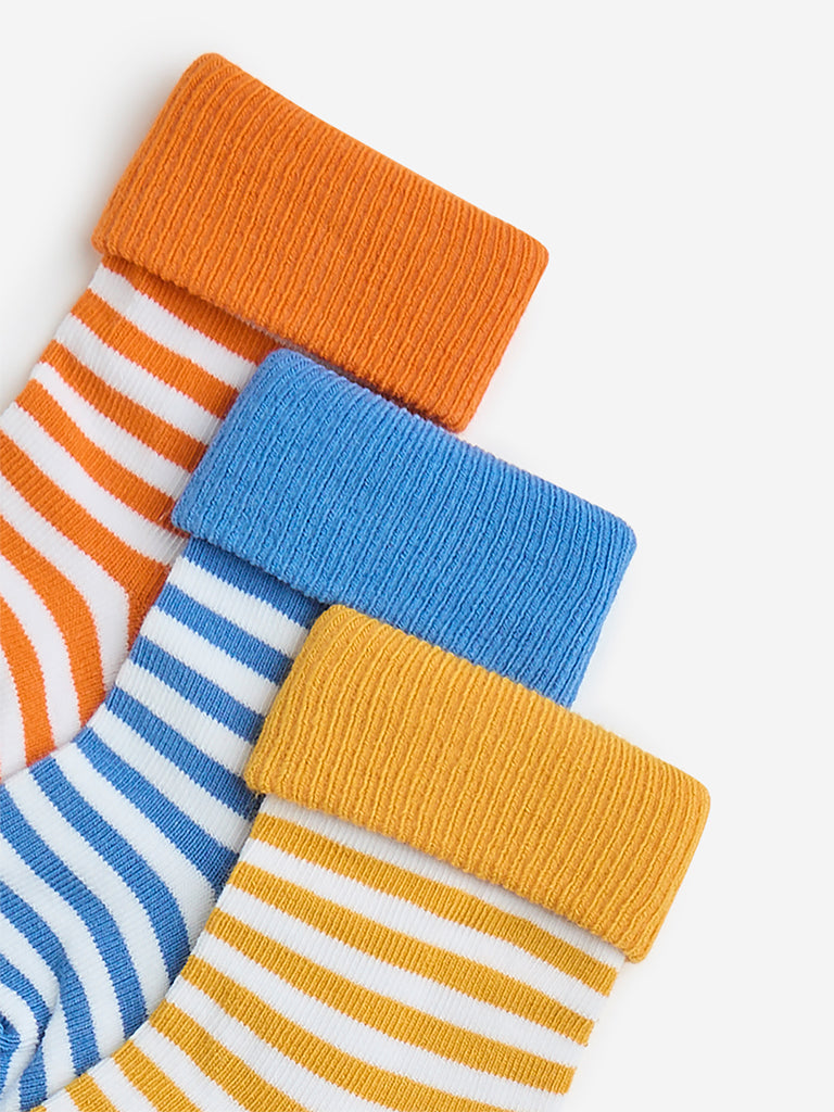 HOP Baby introduces this set of three socks in mustard. orange. and blue variants. featuring classic stripe patterns. Crafted from a soft cotton-blend fabric. they are designed with reinforced heels for added durability and support. making them ideal for everyday wear.