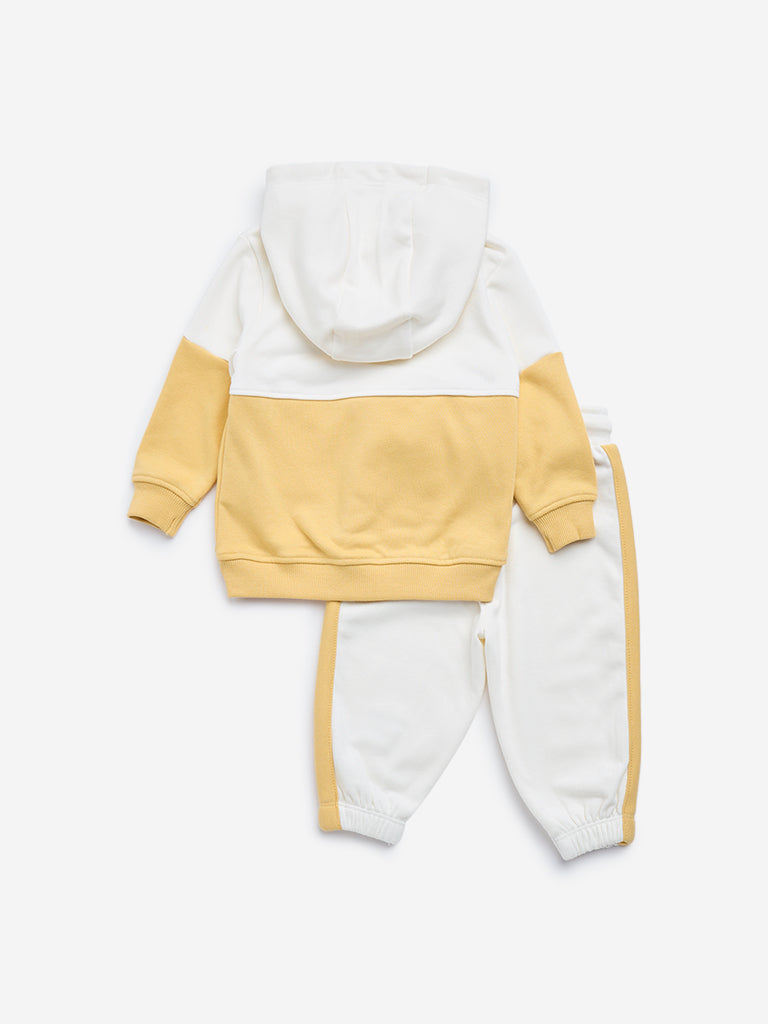 This adorable mustard and white set by HOP Baby features a sweatshirt with a playful dog face applique and matching joggers. Crafted from soft fabric. it combines comfort with a touch of charm.