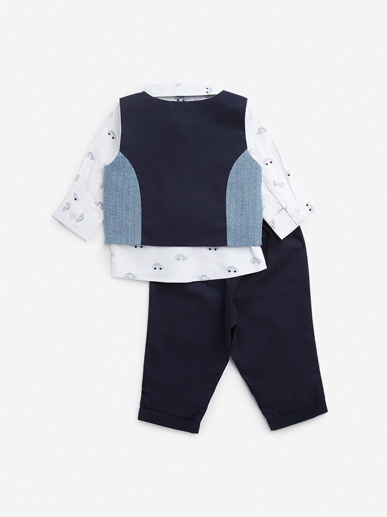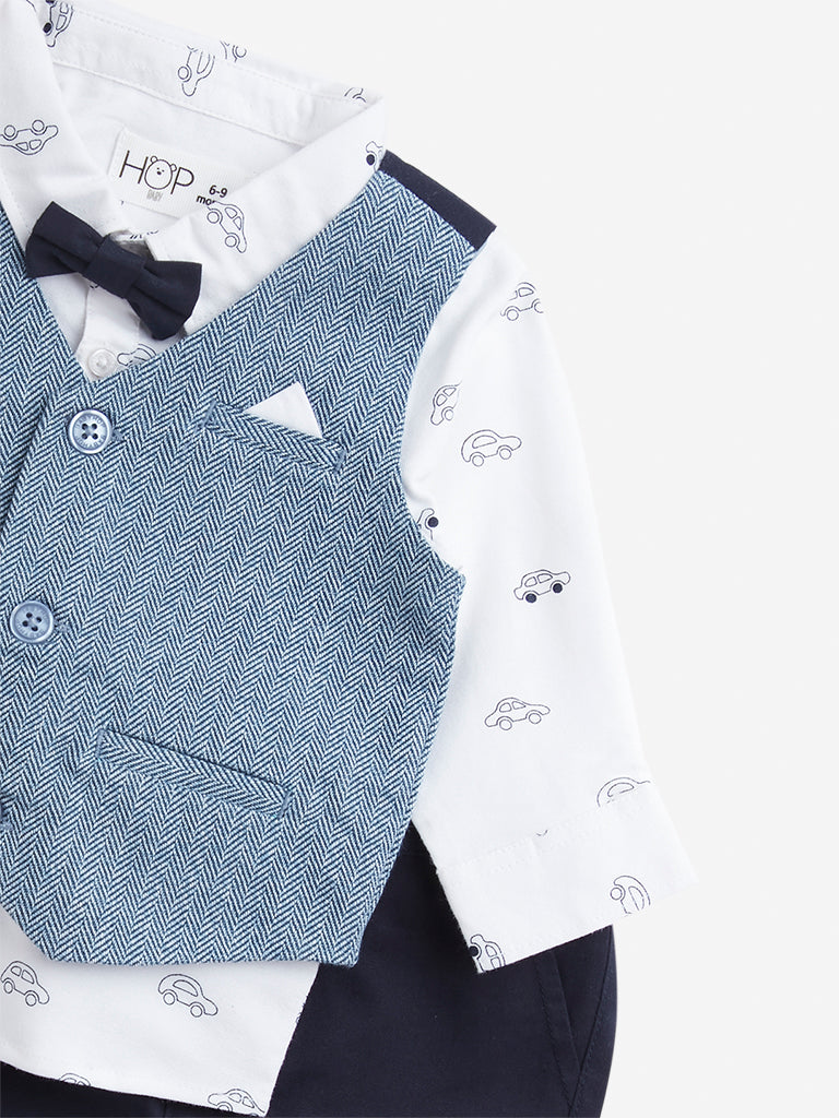 HOP Baby presents this navy set featuring a shirt. waistcoat. trousers and a bow. The shirt is defined with car prints and comes fitted with a collar. button placket and full sleeves. while the waistcoat flaunts geometric patterns. It is accompanied by a pair of trousers and bow to complete the set.