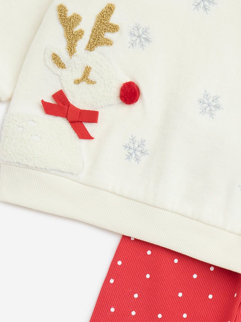 HOP Baby launches this Christmas-themed top and pants set in off-white. The pure cotton garment is designed with reindeer-applique detailing. It includes a round neck and full sleeves. It is paired with mid-rise bottom wear carrying smooth elastic waistband for a proper fit.