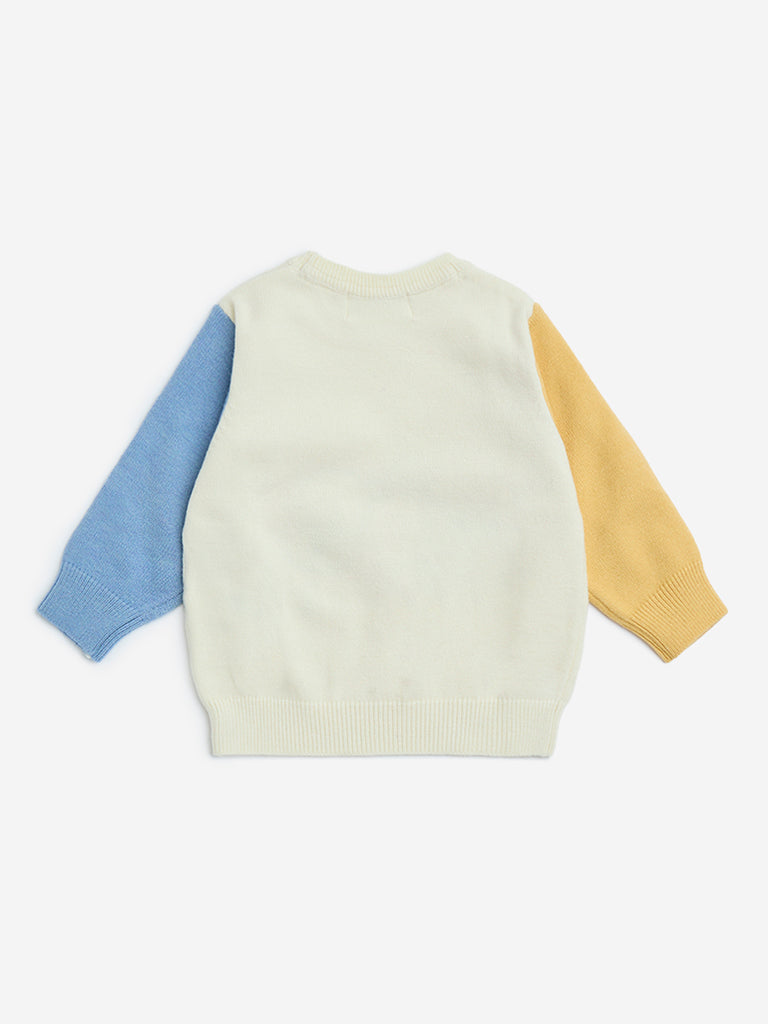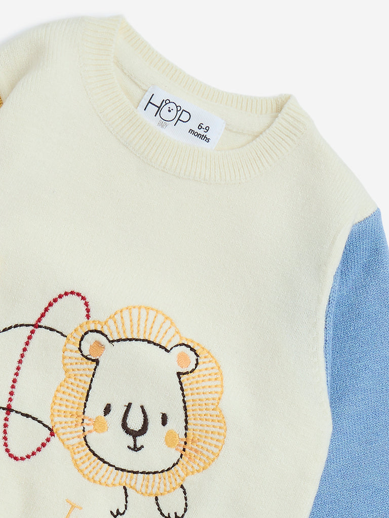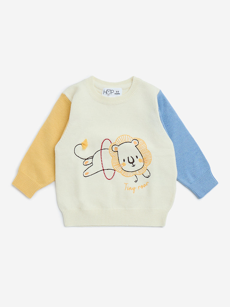 This off-white sweater from HOP Baby features a charming lion embroidered motif. Fitted with a round neck and colourblocked sleeves. it is woven from a breathable fabric. a playful addition for your little one’s cosy wardrobe.