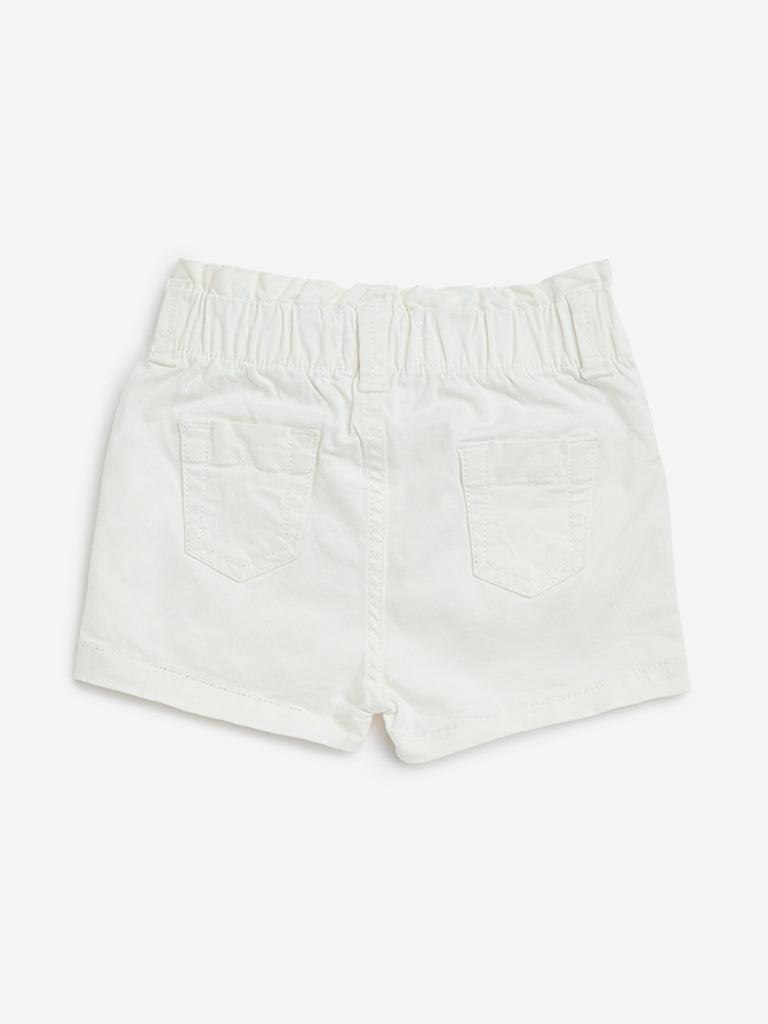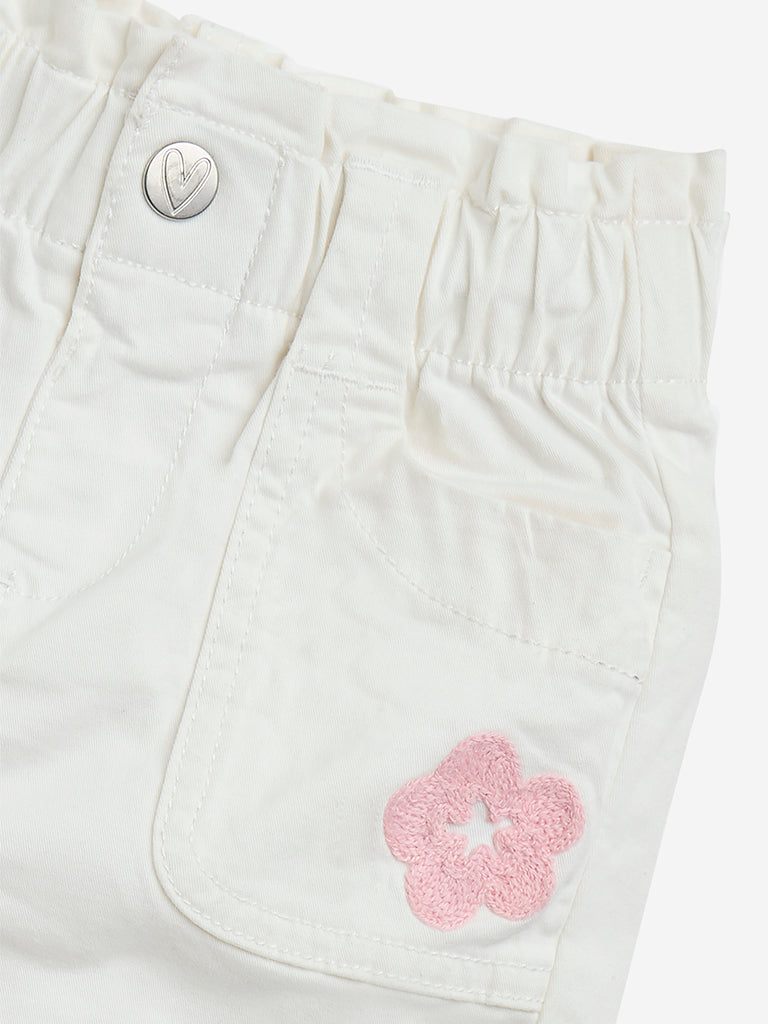 HOP Baby introduces these off-white shorts. crafted from a soft cotton-blend fabric for all-day comfort. Designed with an elasticated waistband. belt loops. and a buttoned closure for a secure fit. this high-rise pair is accented with floral embroidery for a charming touch. Multiple pockets add a practical finish.