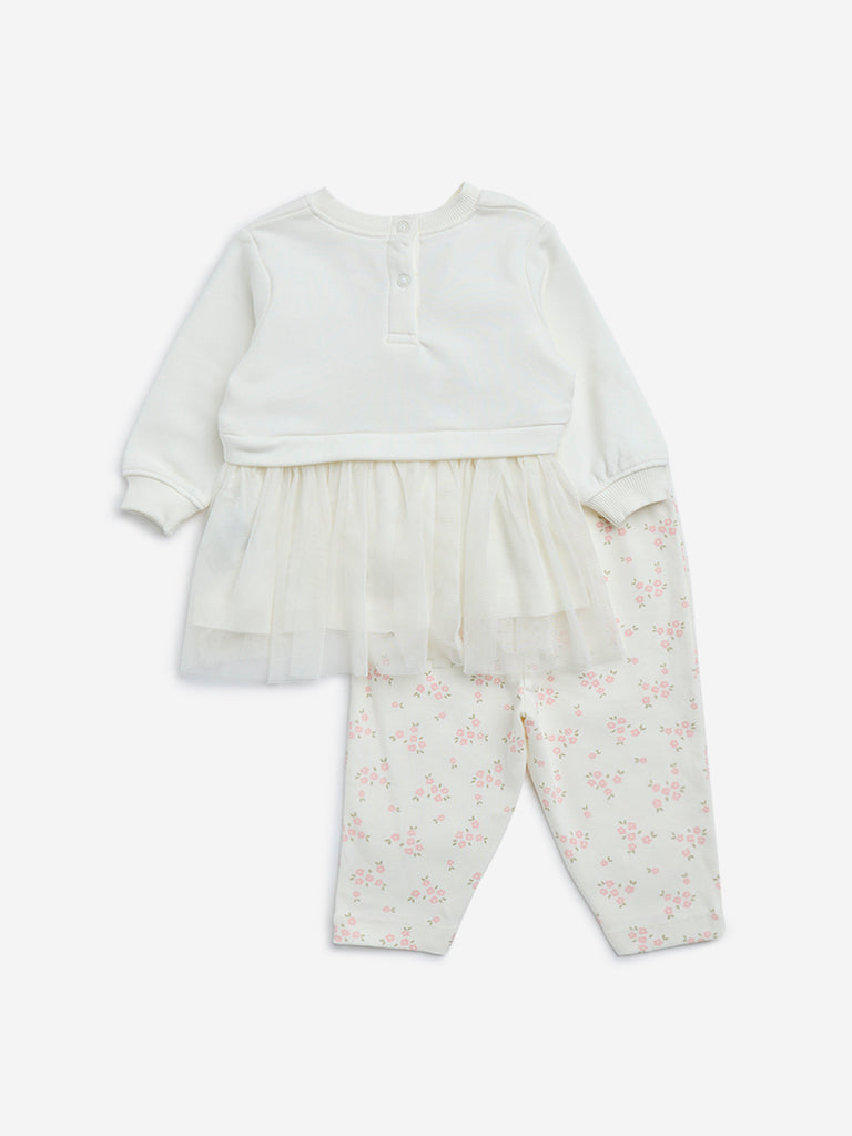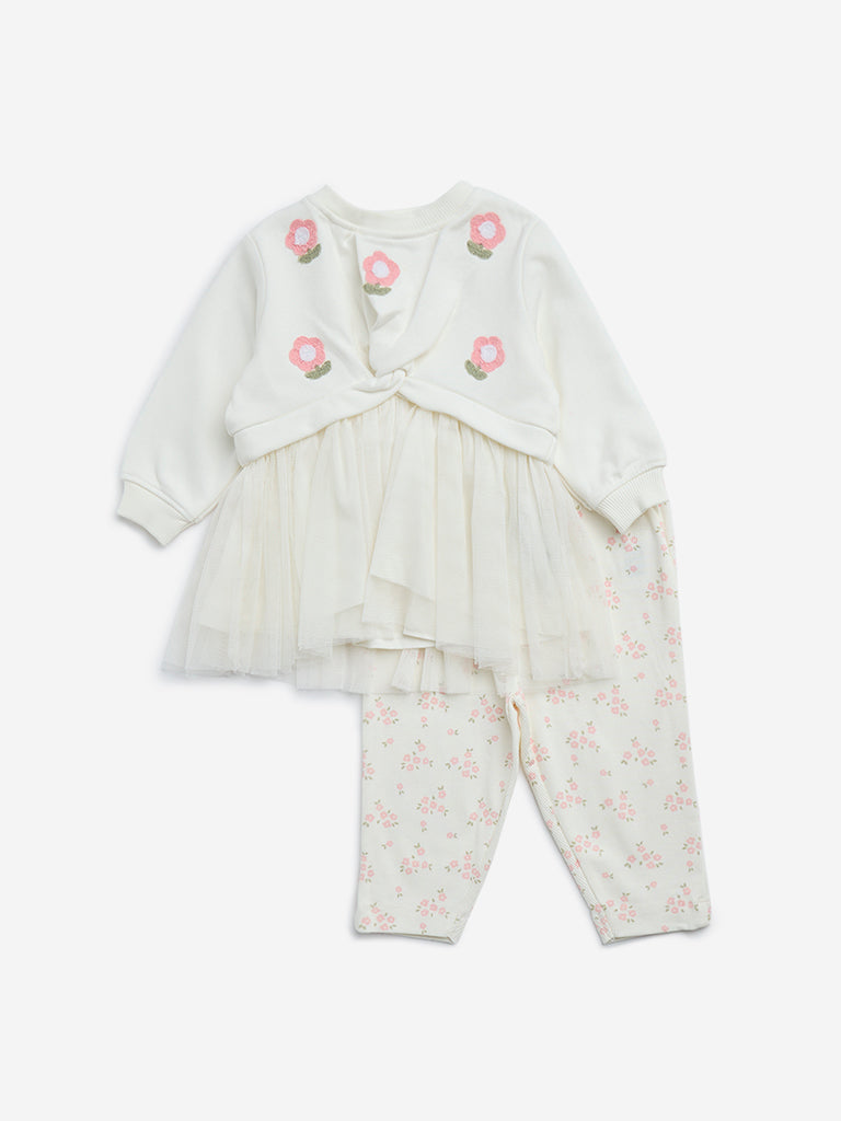 HOP Baby Off-White Floral Embroidered Cotton-Blend Dress with Pants Set