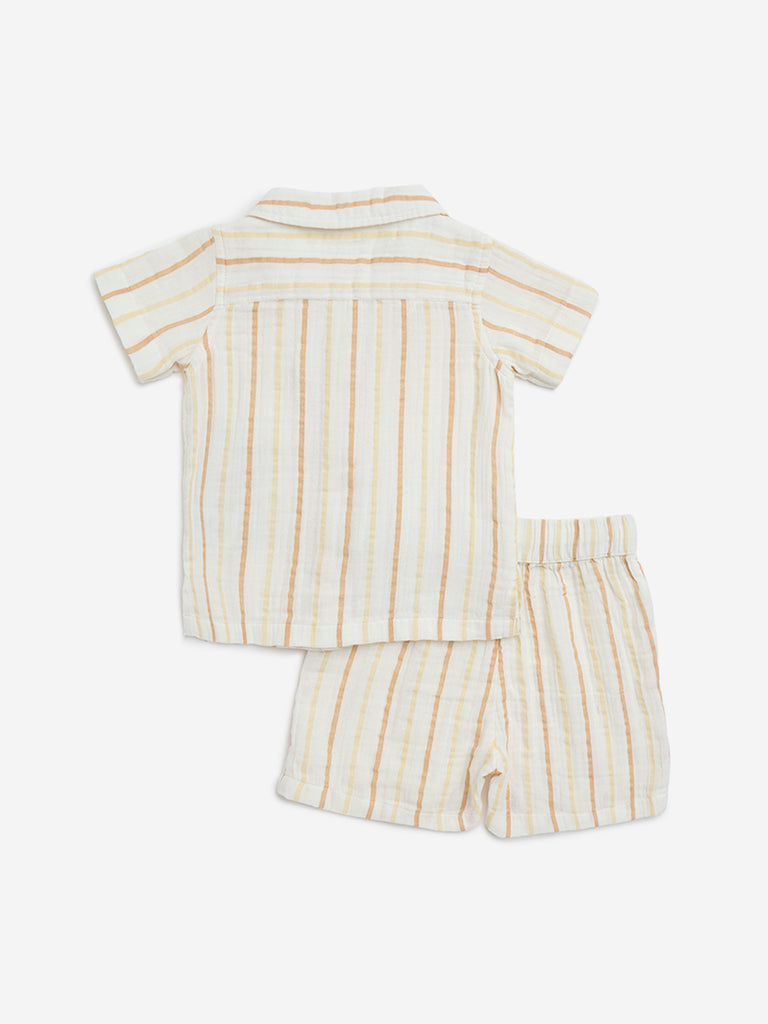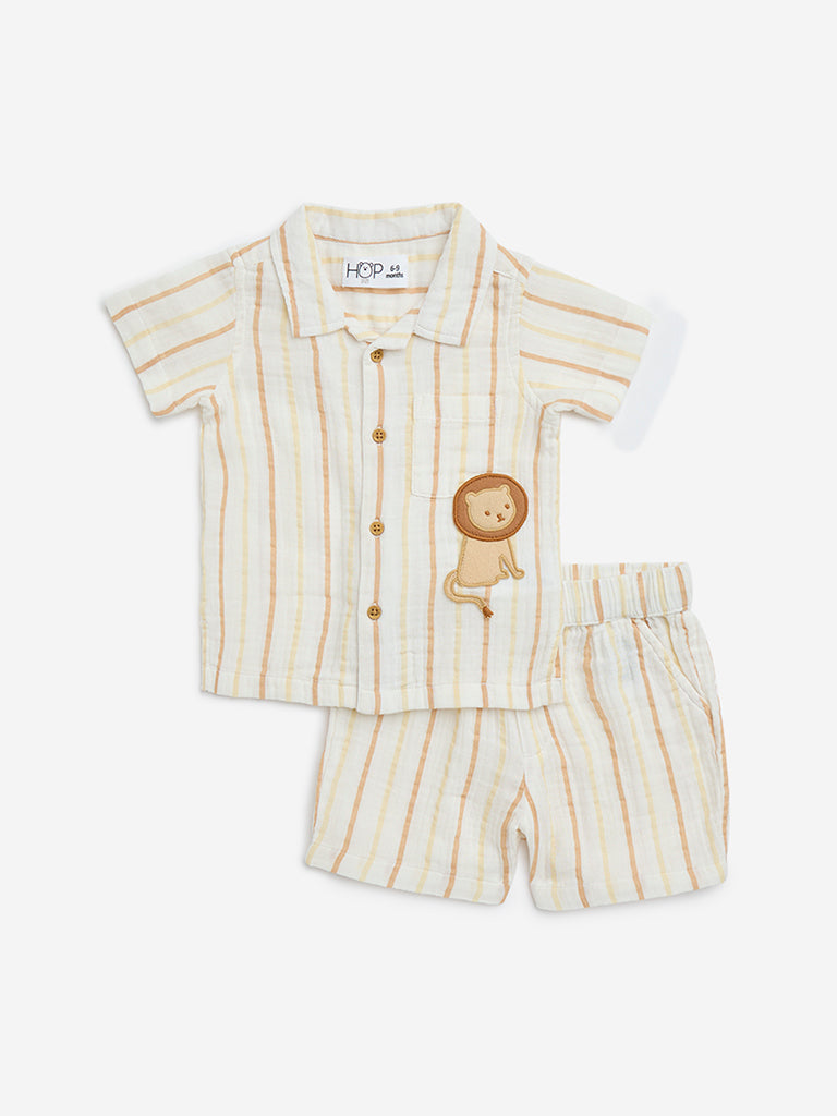 HOP Baby Off-White Striped Cotton Shirt with Shorts Set