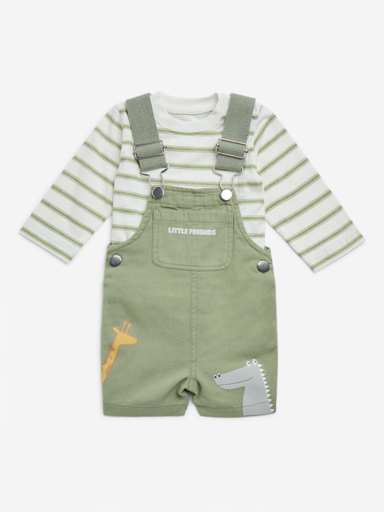 HOP Baby Olive Animal Design Cotton Dungaree & T-Shirt Set