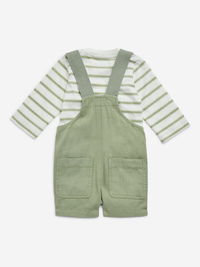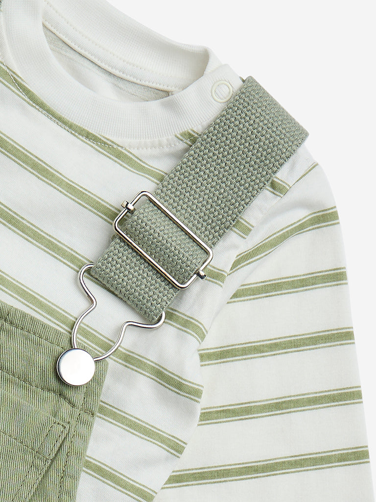 This olive set from HOP Baby includes a dungaree and t-shirt. The dungaree showcases animal prints and comes fitted with adjustable straps for easy wearability. The striped t-shirt perfectly completes the ensemble.