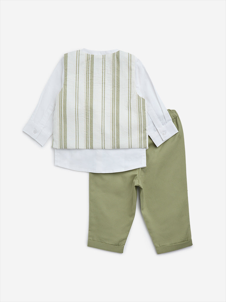 This olive set by HOP Baby includes a shirt. waistcoat. and pants. The striped design waistcoat is paired with a white shirt featuring a mandarin collar and full sleeves. The set is completed by a pair of solid olive pants.