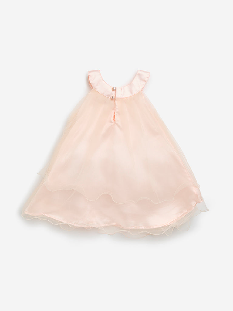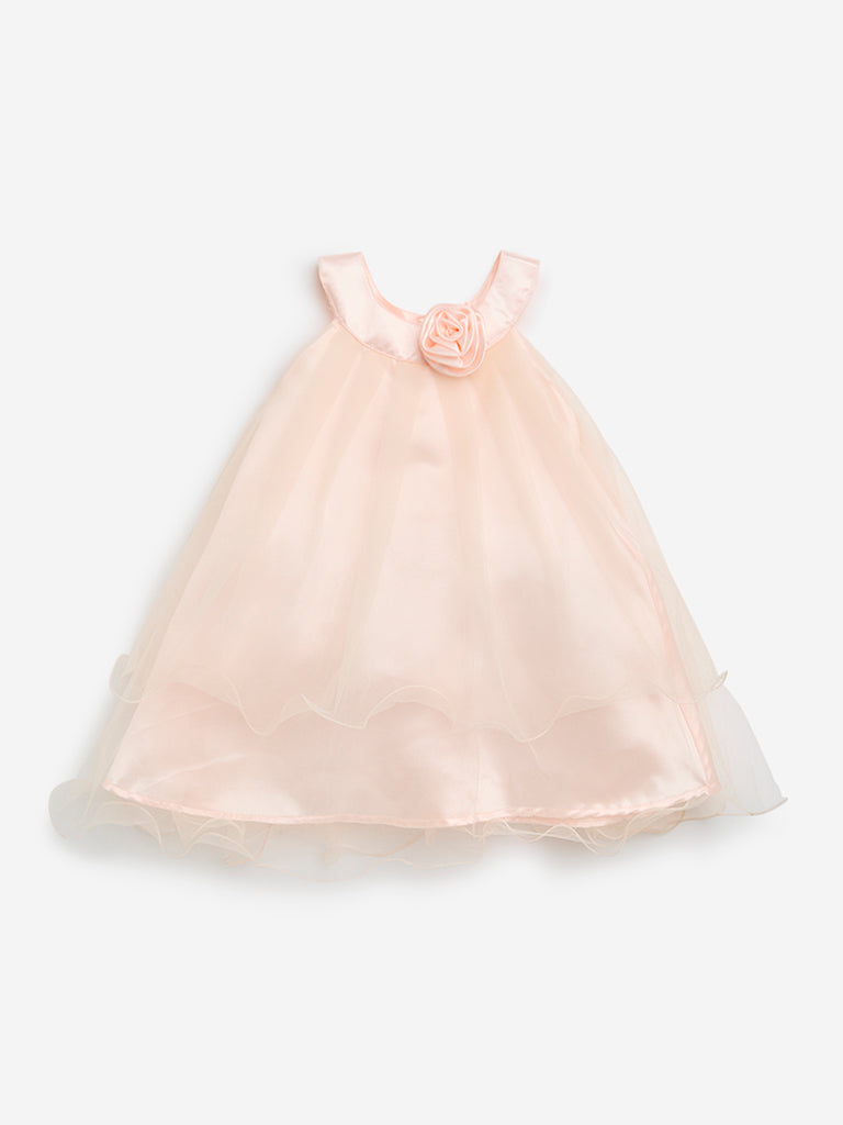 This peach dress from HOP Baby is crafted from lightweight fabric for effortless movement and comfort. A soft mesh overlay adds a layered effect. while the rosette detail at the neckline brings a delicate touch. This A-line dress is an ideal pick for special occasions and celebrations for your little one.
